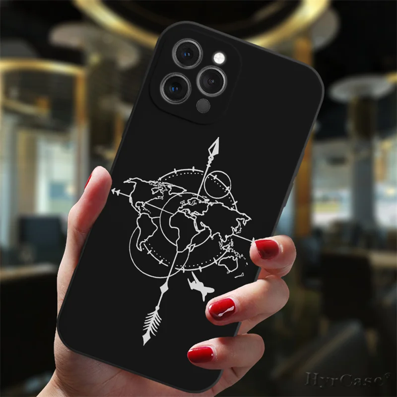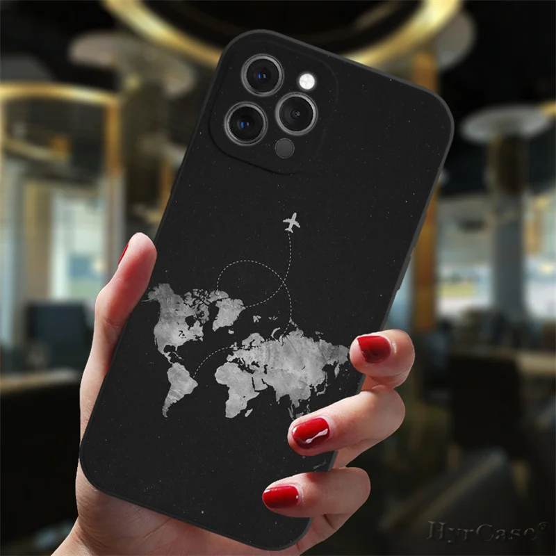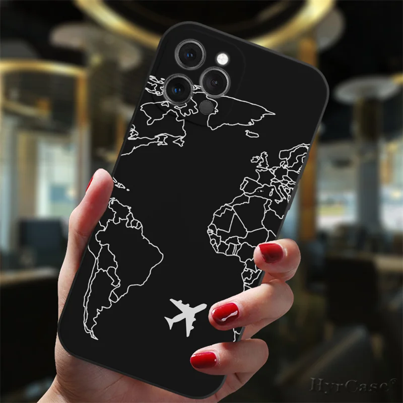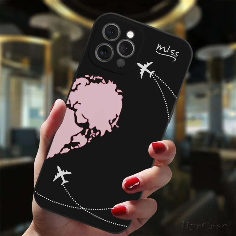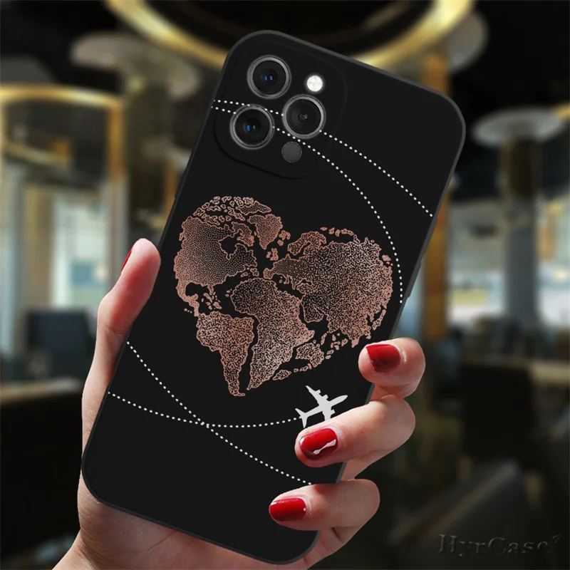 Para iPhone 13 12 11 14 Pro Max Mini 15 Plus funda negra aviones populares mapa del mundo viaje amor corazón parejas silicona mate cubierta