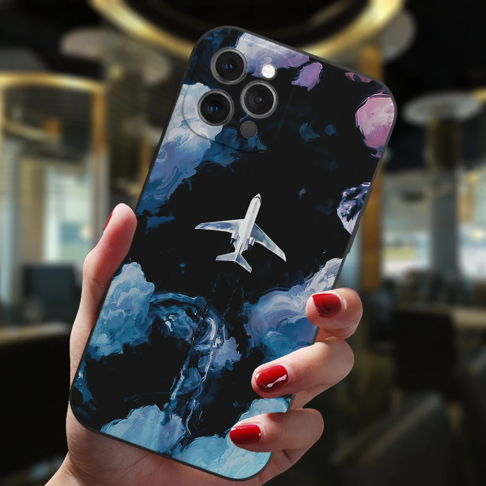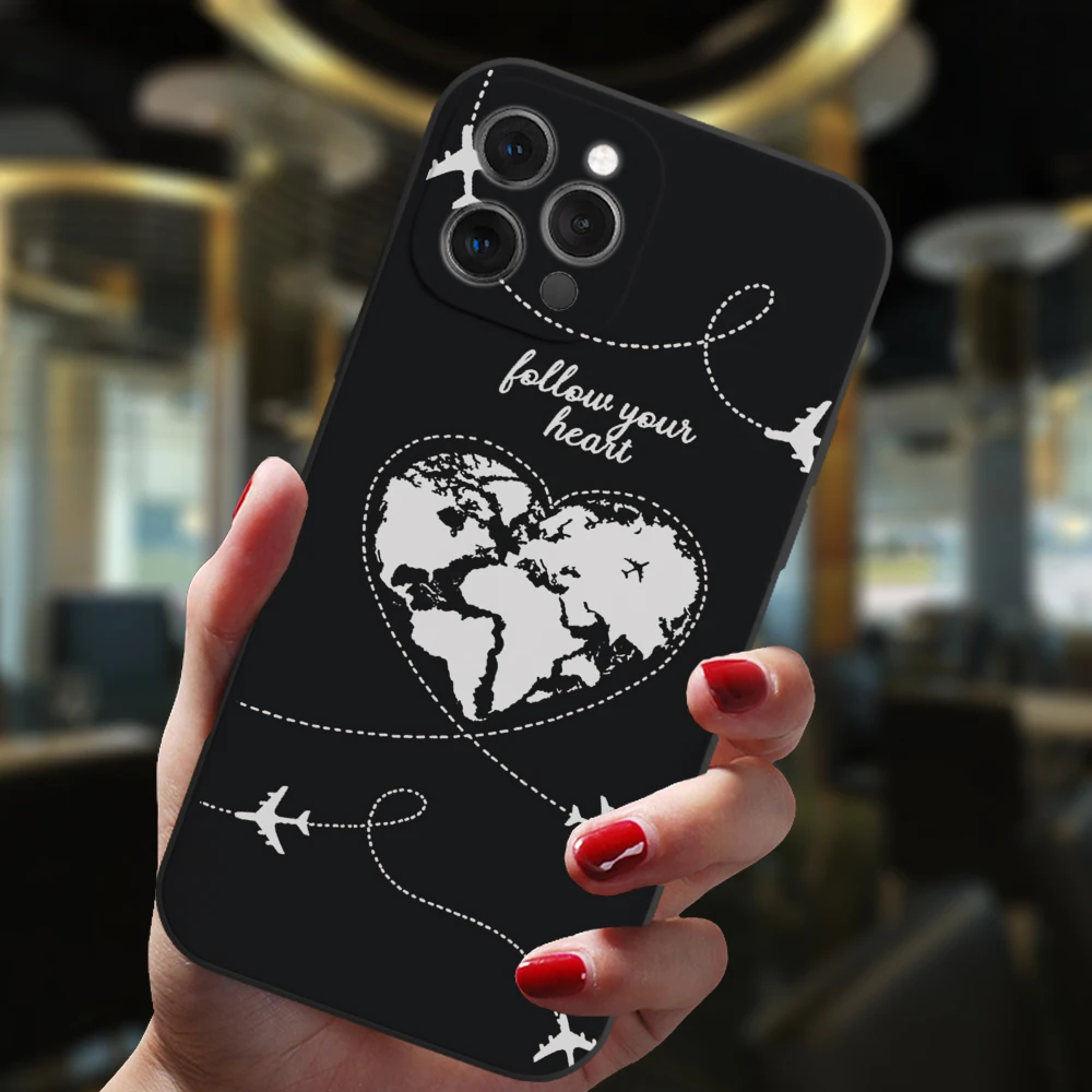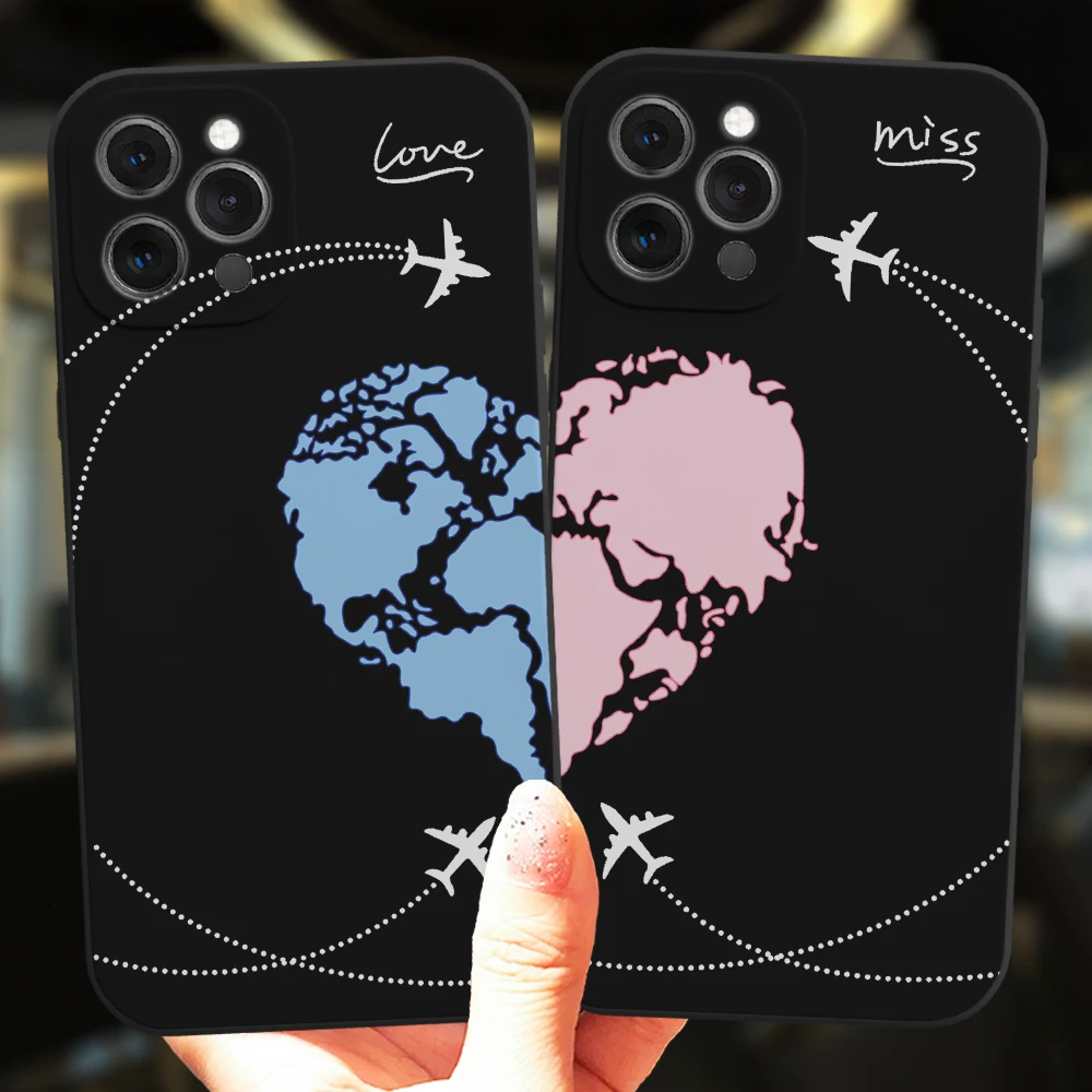 Para iPhone 13 12 11 14 Pro Max Mini 15 Plus funda negra aviones populares mapa del mundo viaje amor corazón parejas silicona mate cubierta