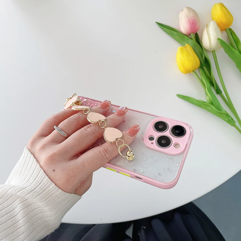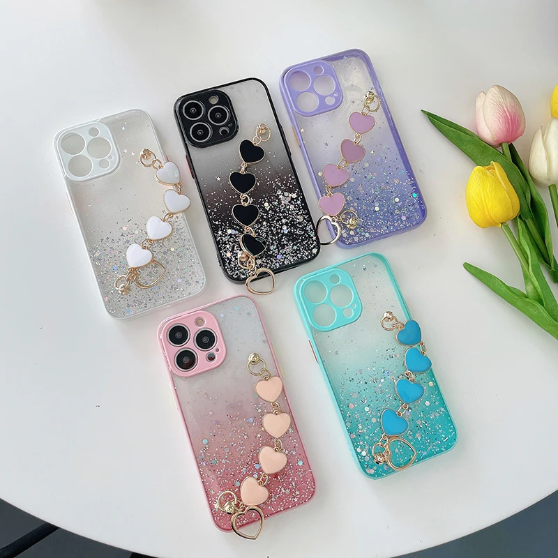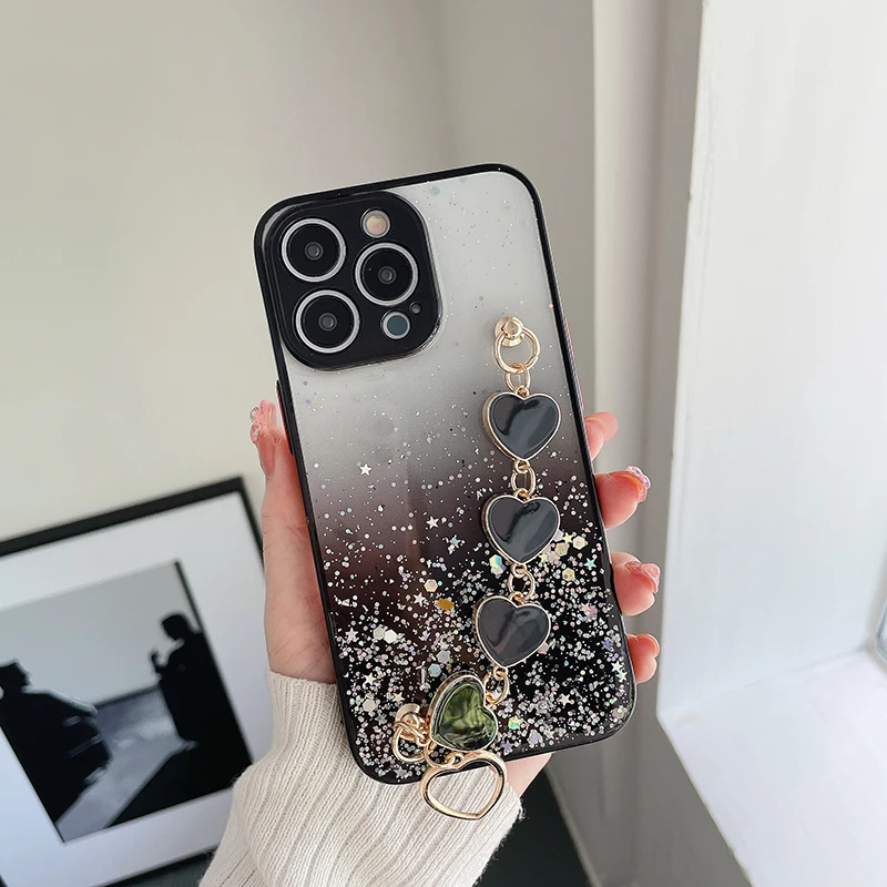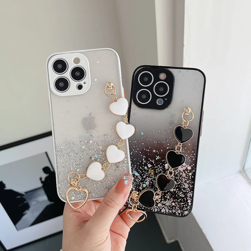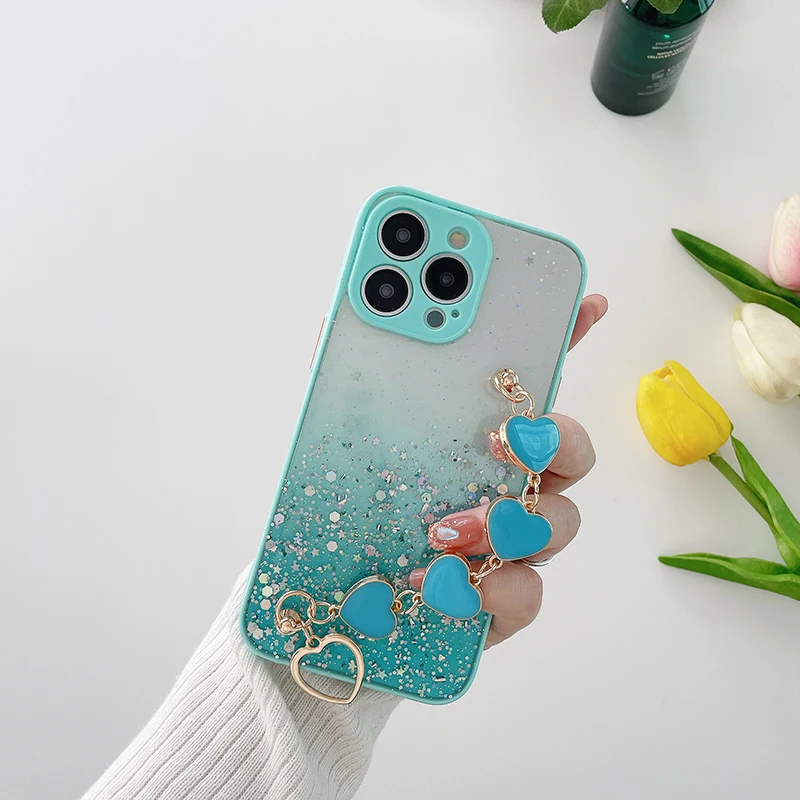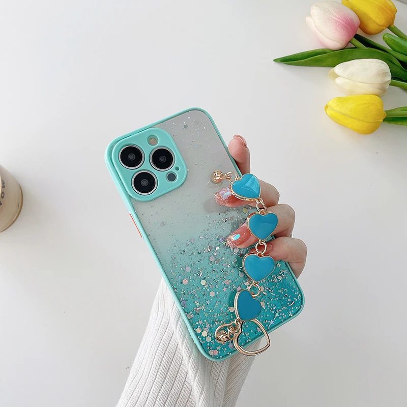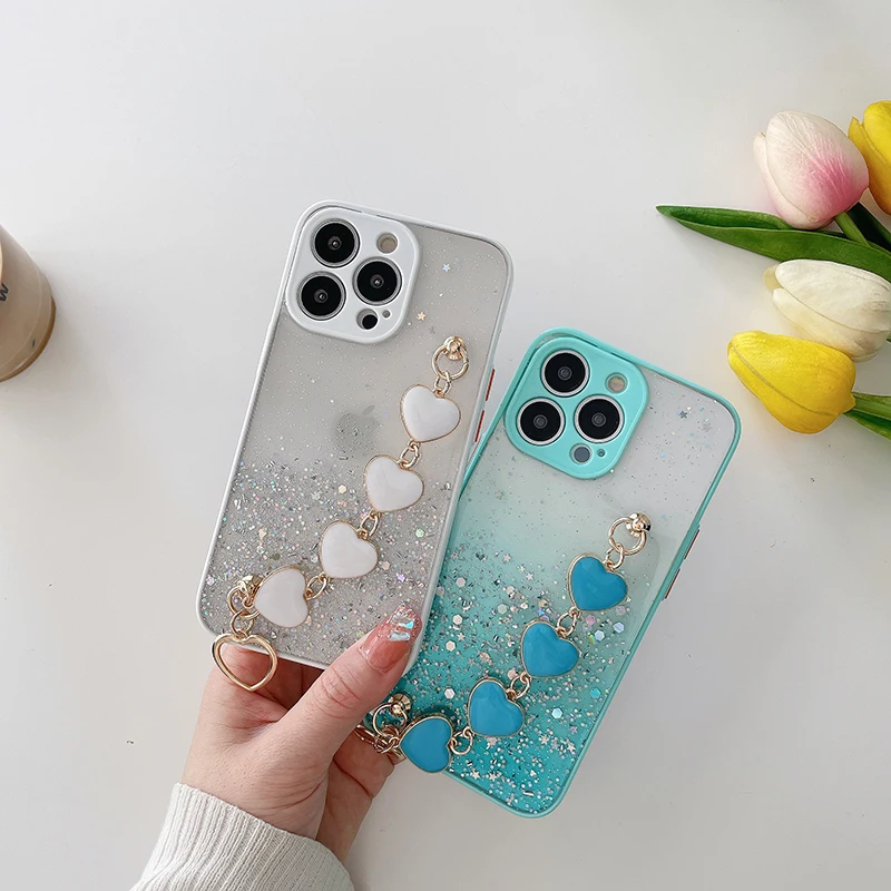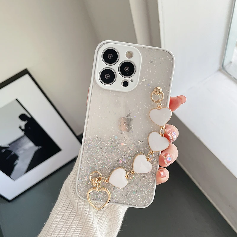 Funda de teléfono con pulsera de corazón de amor brillante de lujo para iPhone 13 11 Pro Max XR XS 7 8 Plus SE2 12Mini Cadena de muñeca funda de silicona ostentosa