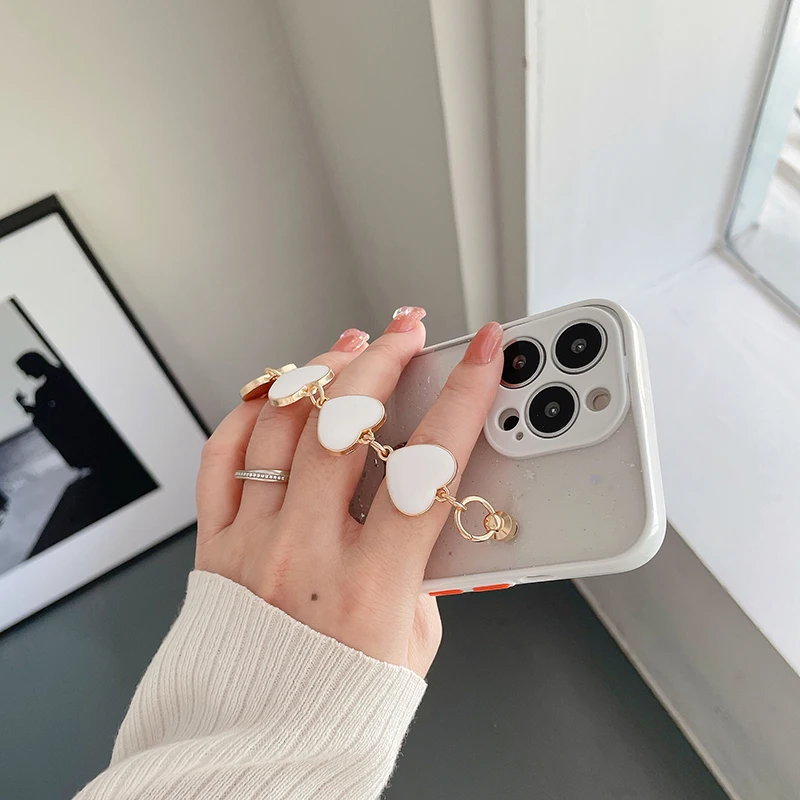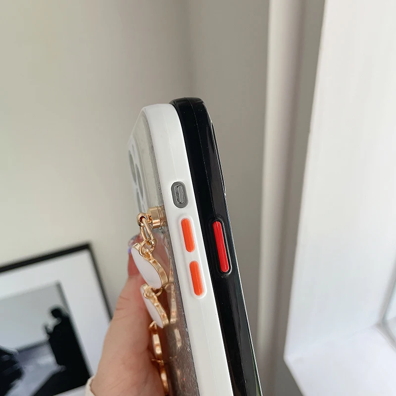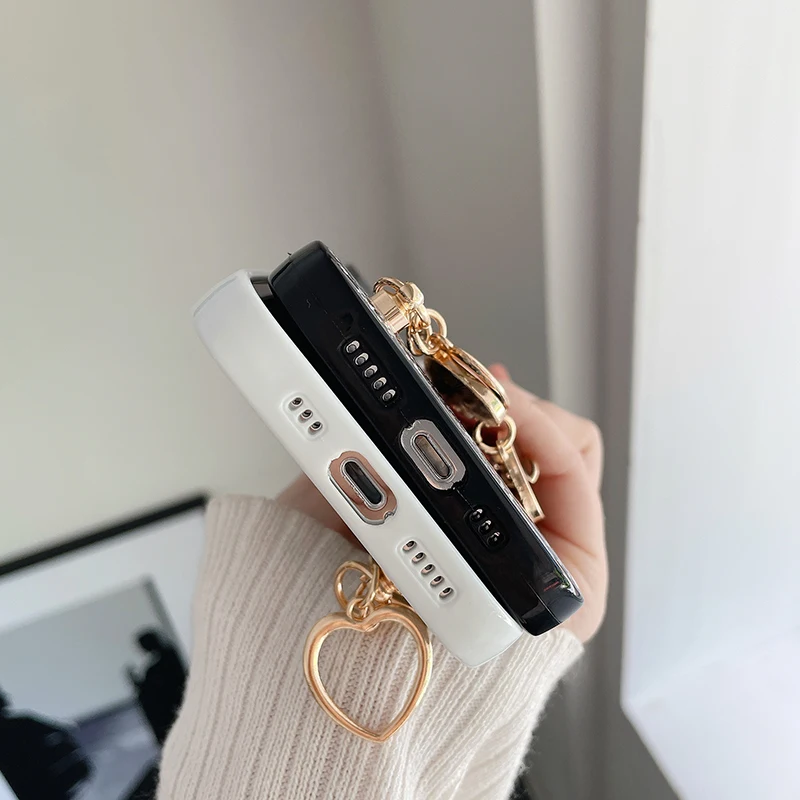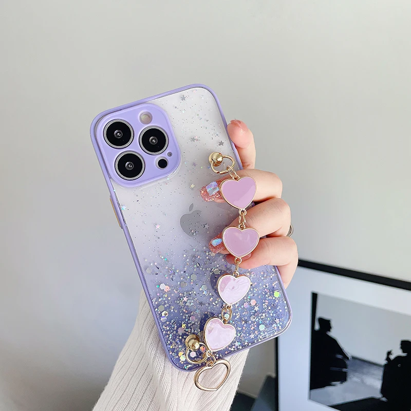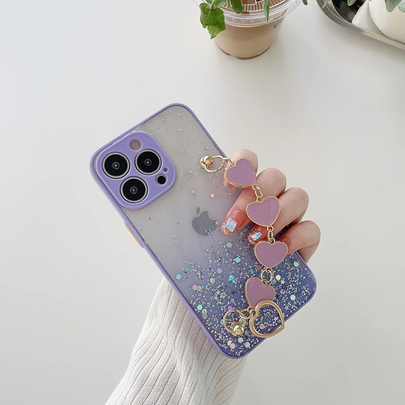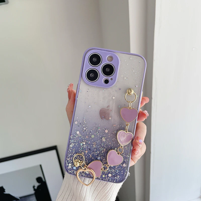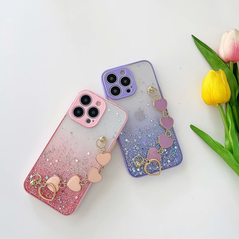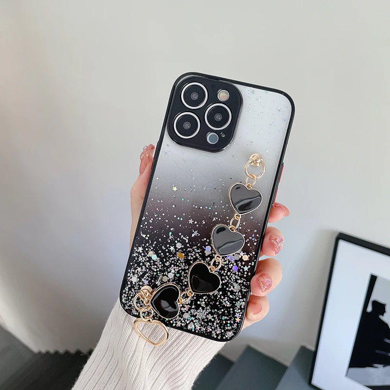 Funda de teléfono con pulsera de corazón de amor brillante de lujo para iPhone 13 11 Pro Max XR XS 7 8 Plus SE2 12Mini Cadena de muñeca funda de silicona ostentosa