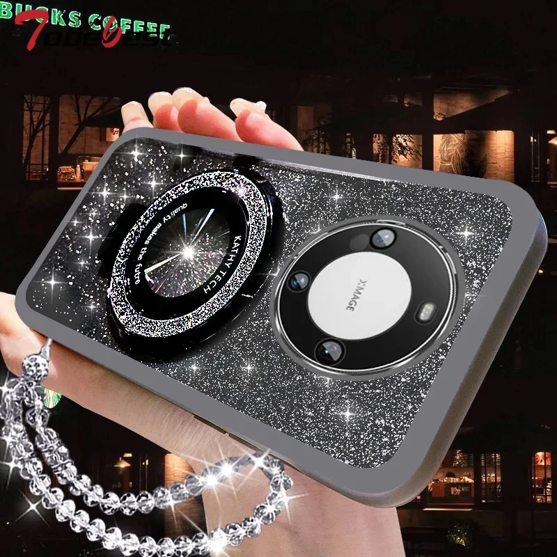 Funda con soporte para teléfono Magsafe con pulsera de cristal brillante para Huawei Mate 60 50 40 30 20 Pro, funda de silicona