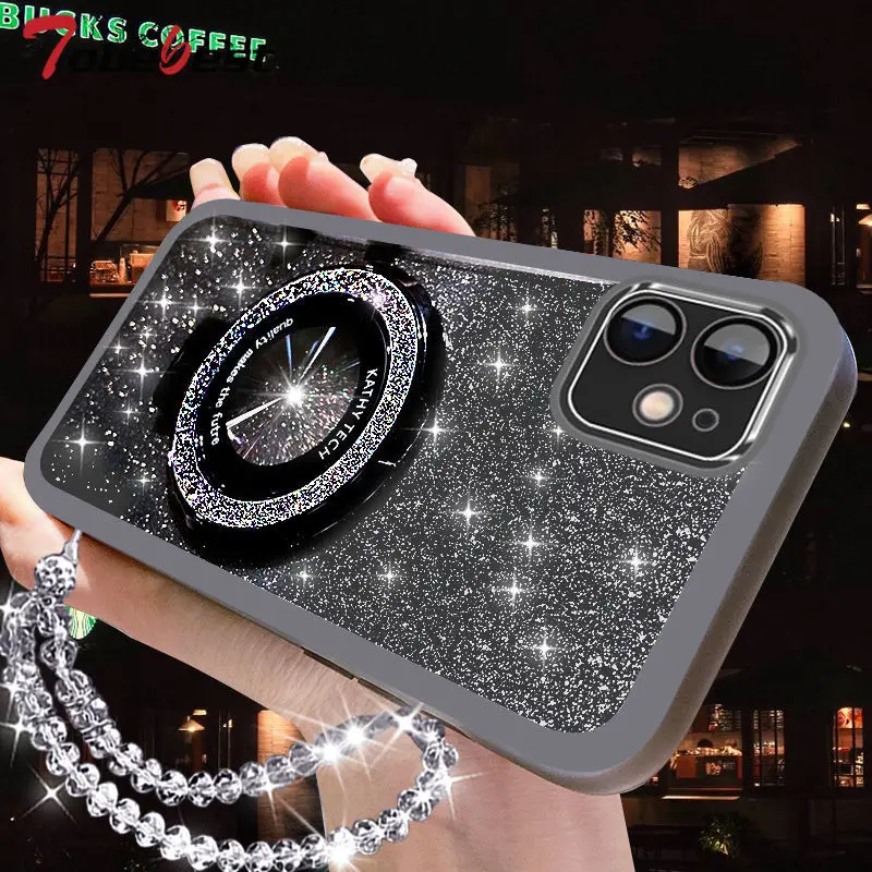 Funda de silicona con soporte Magsafe para iphone, carcasa con purpurina y cristal para modelos 16, 15, 14, 13, 12, 11 Pro, XS Max, XR, X, 8, 7 Plus, SE 2020