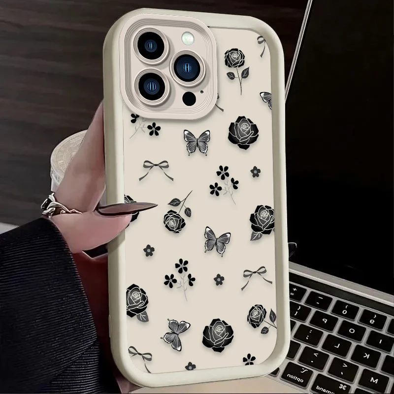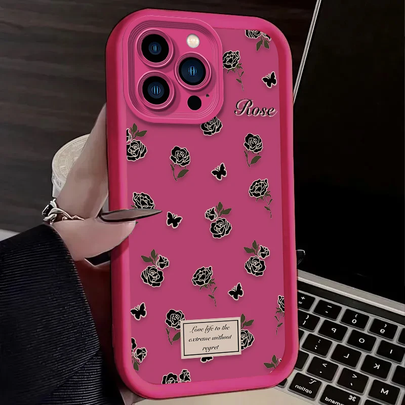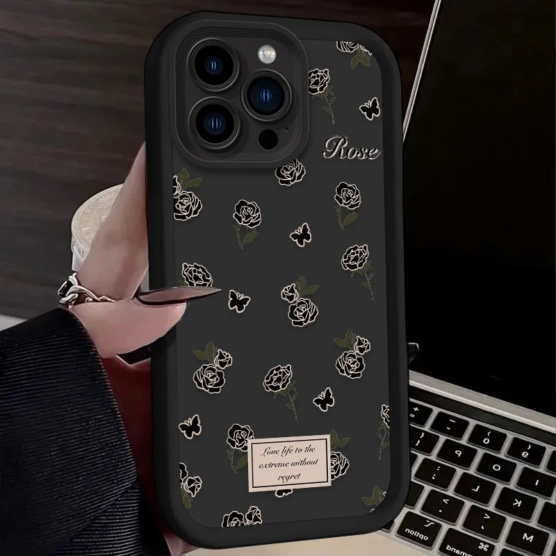 Funda de silicona suave con flor de rosa negra para iPhone 16 15 14 13 12 11 Pro Max X XS X S Max XR SE 2020 7 8 Plus contraportada a prueba de golpes