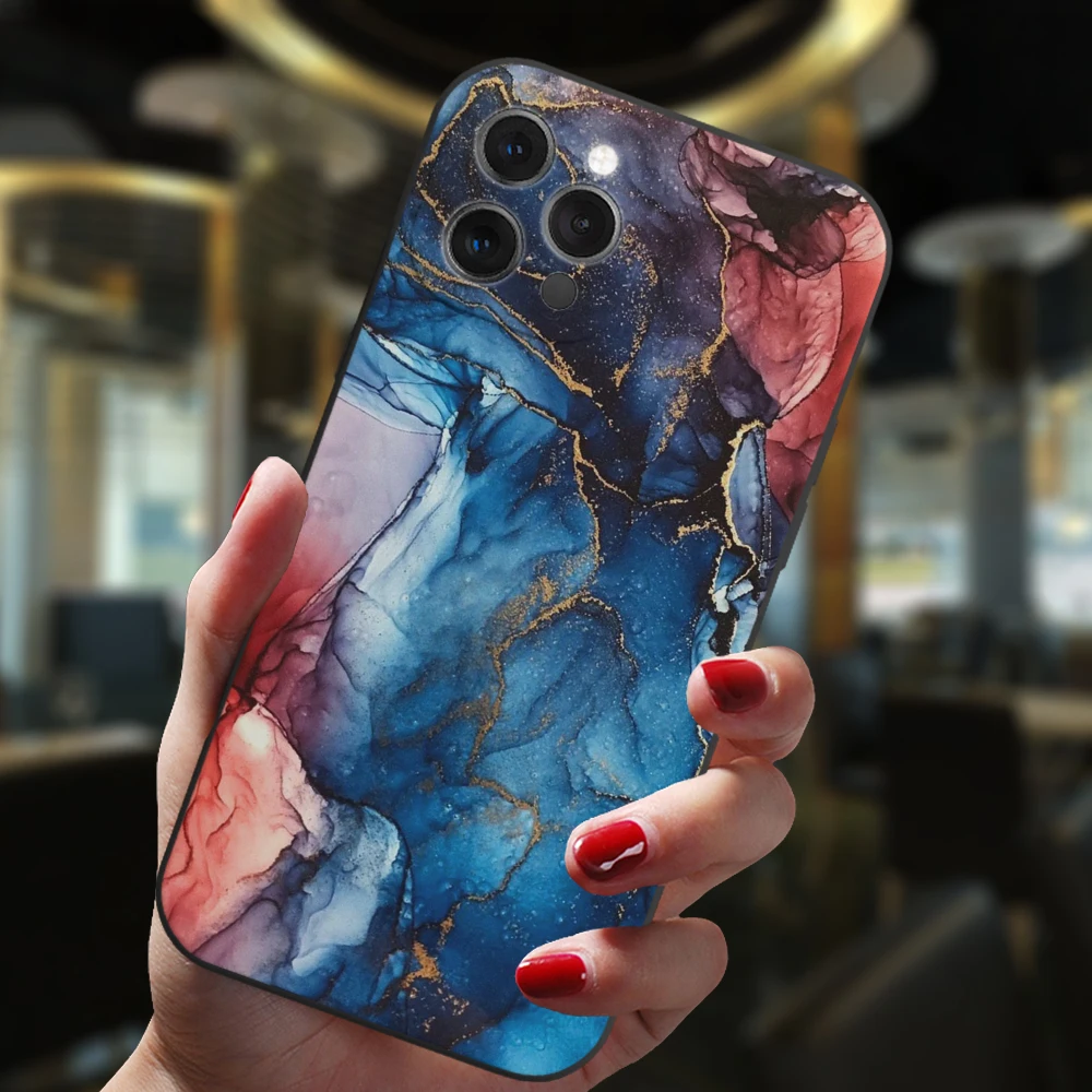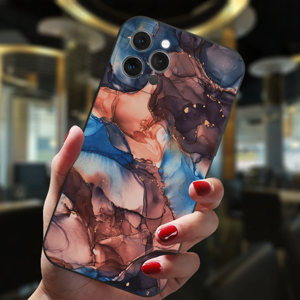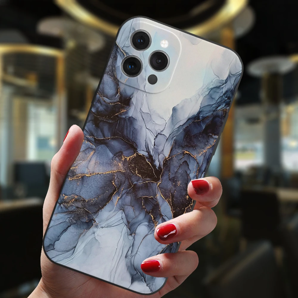 Para iPhone 13 12 11 14 Pro Max Mini XS XR 14Plus funda negra Popular gradiente de mármol del océano moda silicona suave cubierta mate