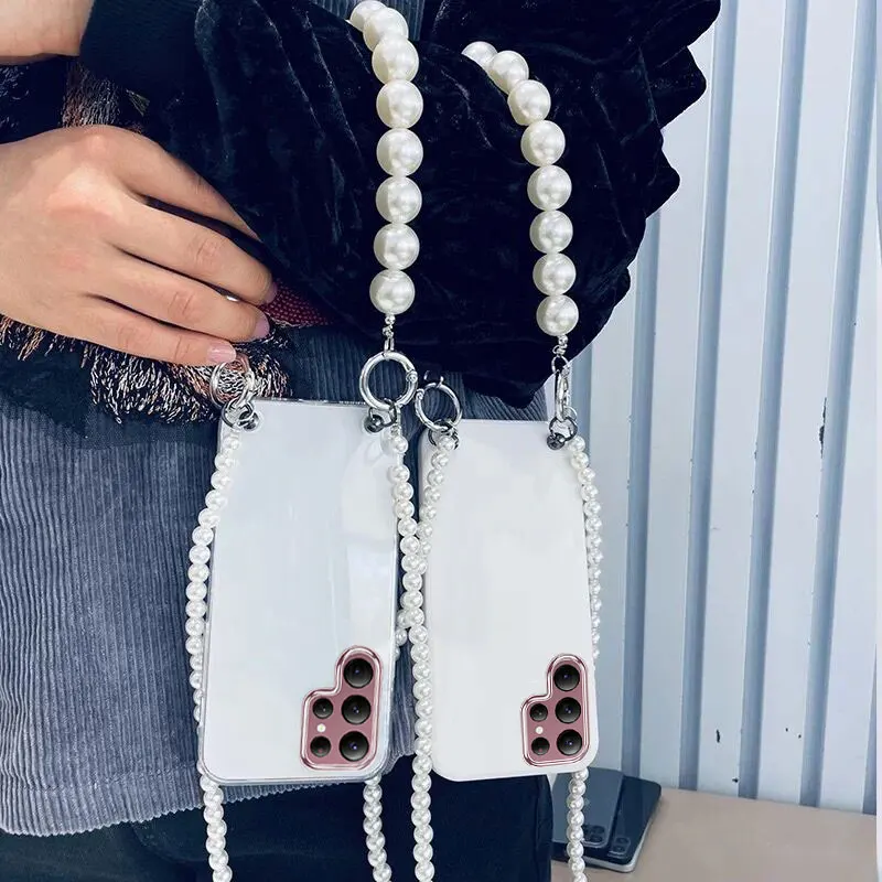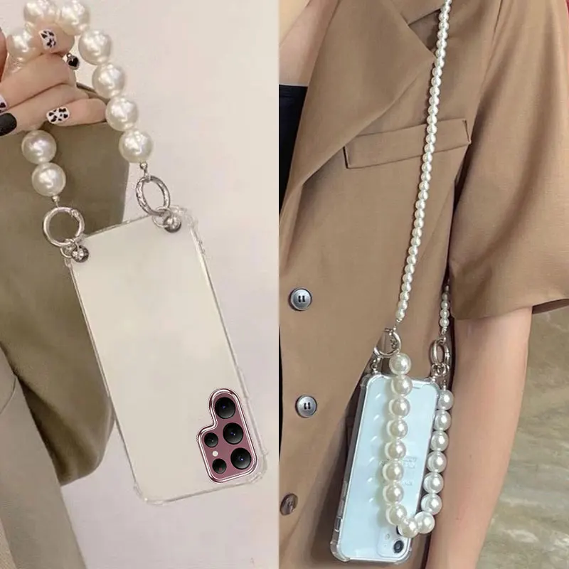 Funda de collar con cordón cruzado y cadena de perlas para Samsung S23 Ultra S23 Plus, funda transparente a prueba de golpes para Samsung S22 S21 Ultra Plus