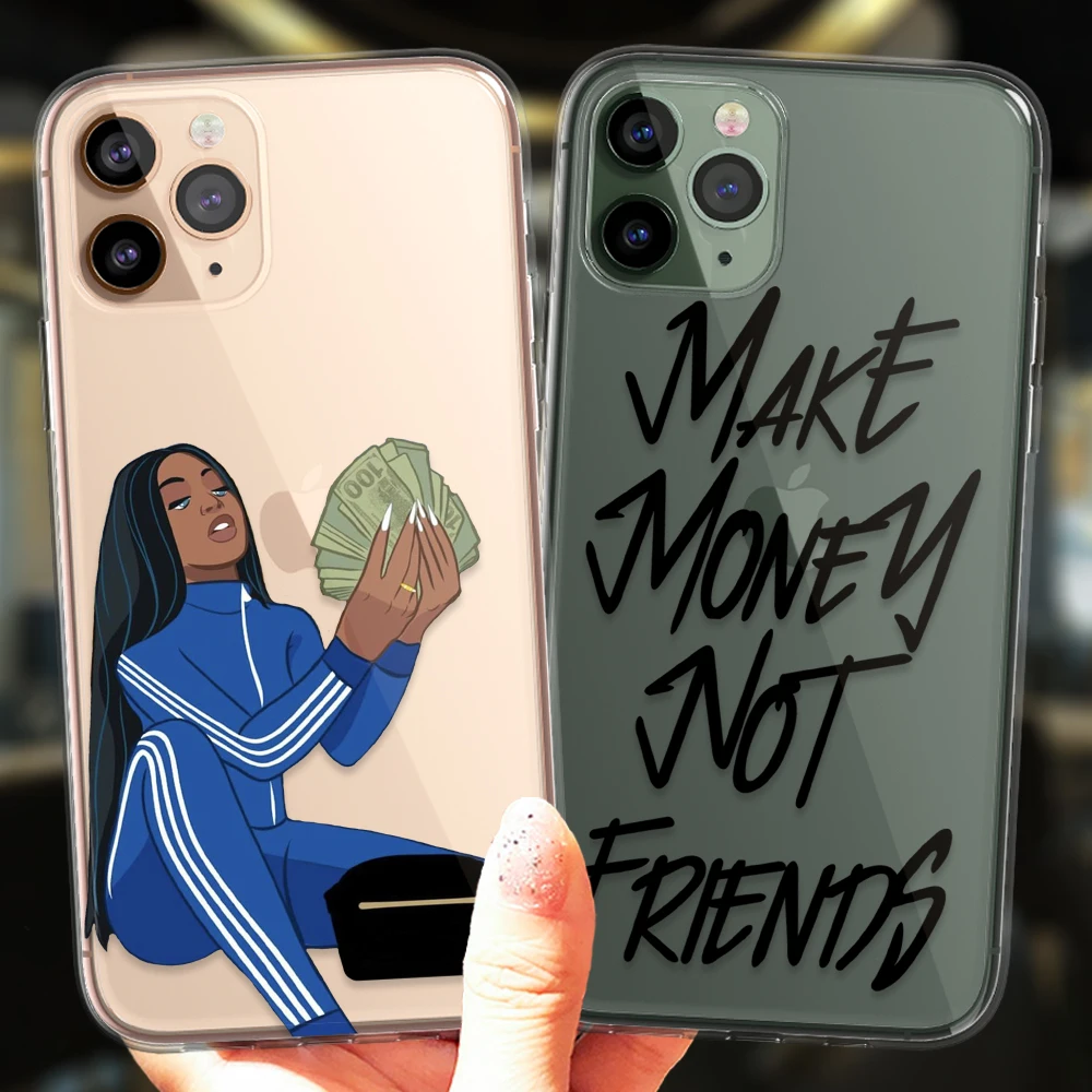 Comprar Funda de silicona suave transparente para iPhone 13, 12, 11, 14 Pro Max, Mini, 15 Plus, 15Pro Max, MAKE MONEY, no Friends, Kash, Afro