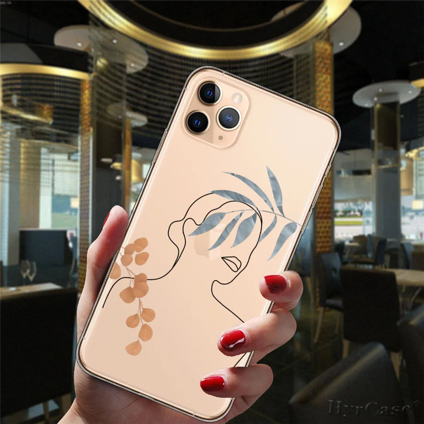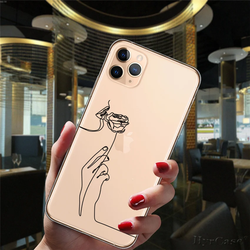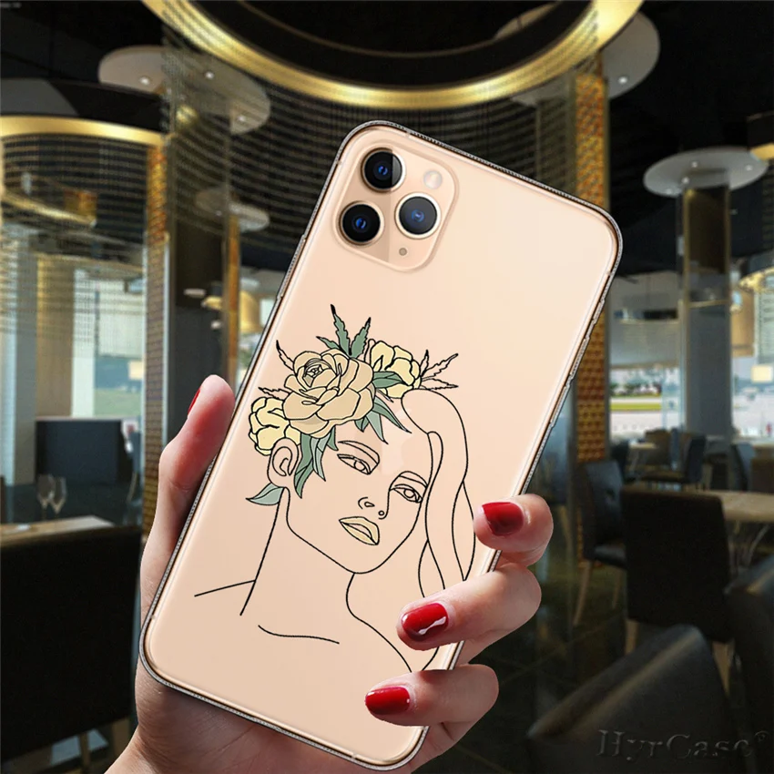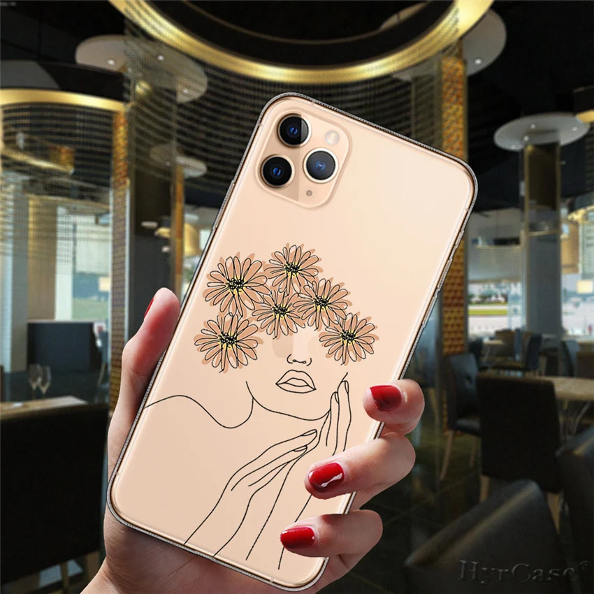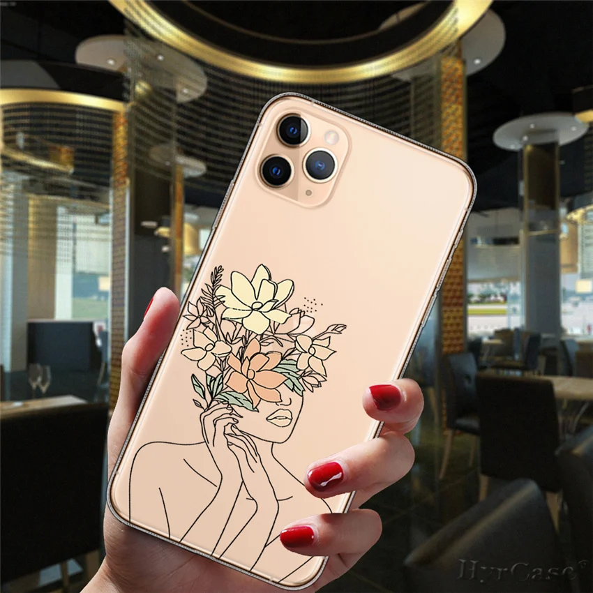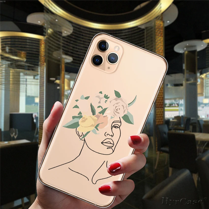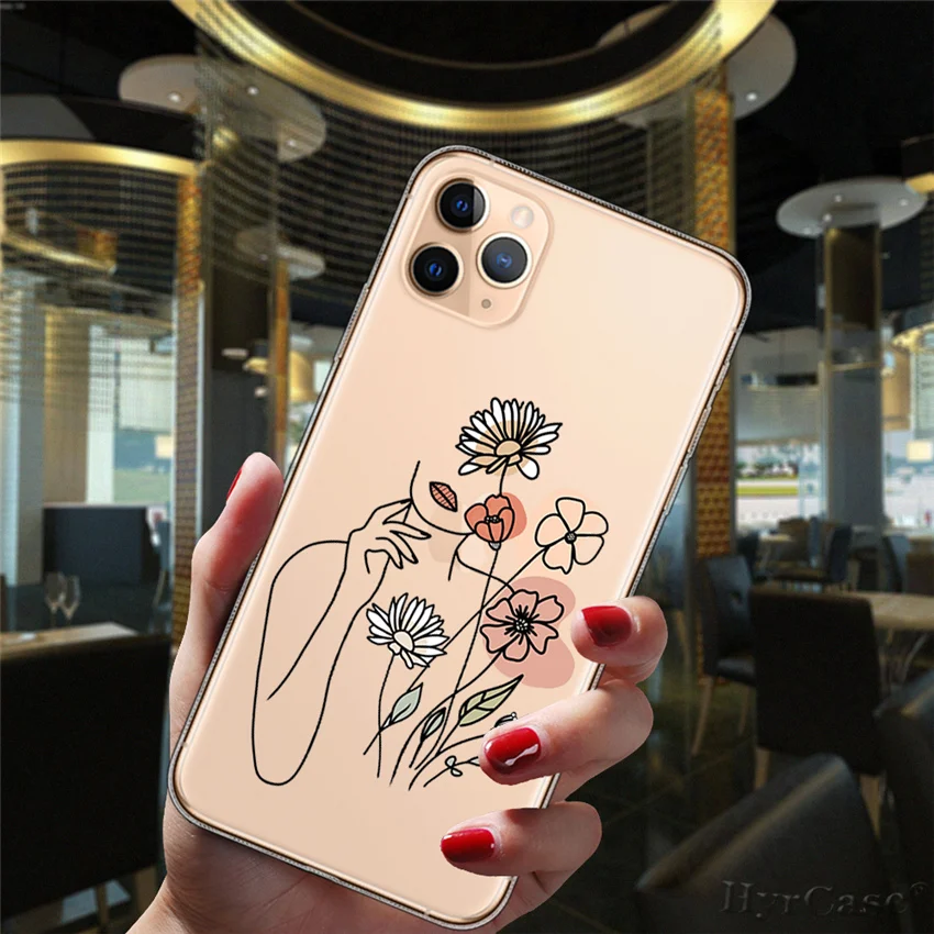 Para iPhone 13 12 11 14 Pro Max Mini 15 Plus 15ProMax funda Minimal Line Art Mujer con flor Funda de silicona suave transparente