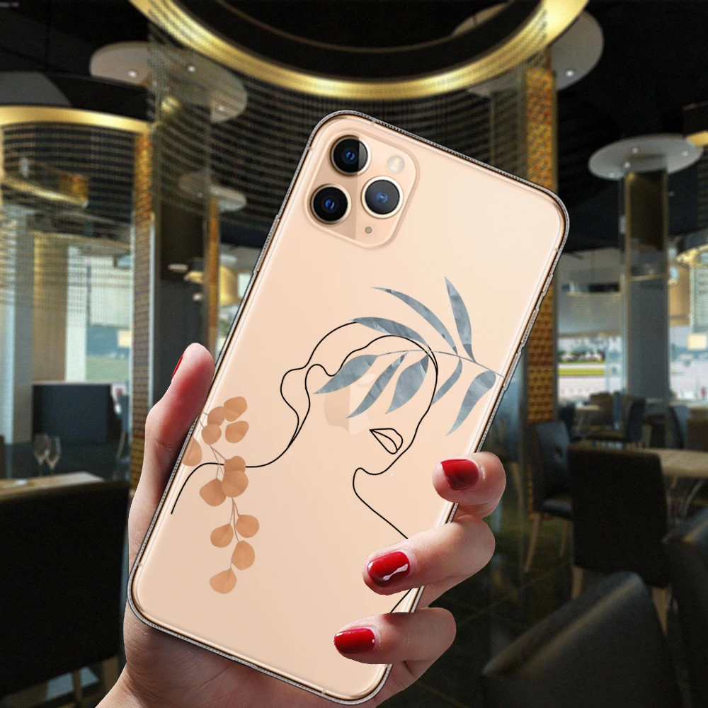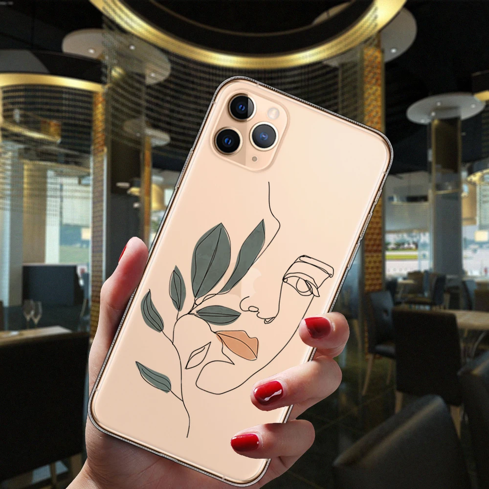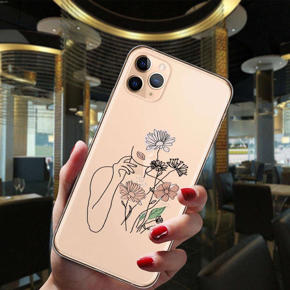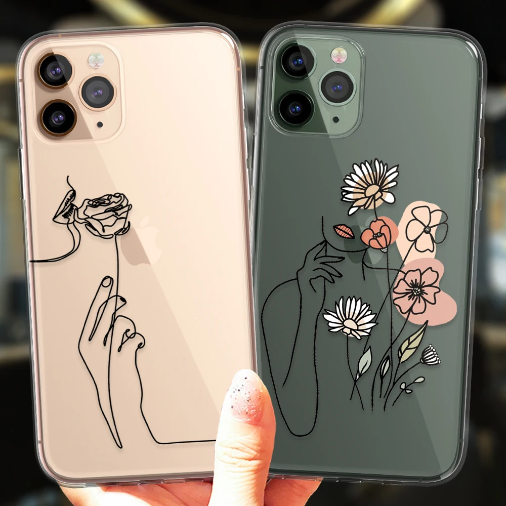Para iPhone 13 12 11 14 Pro Max Mini 15 Plus 15ProMax funda Minimal Line Art Mujer con flor Funda de silicona suave transparente