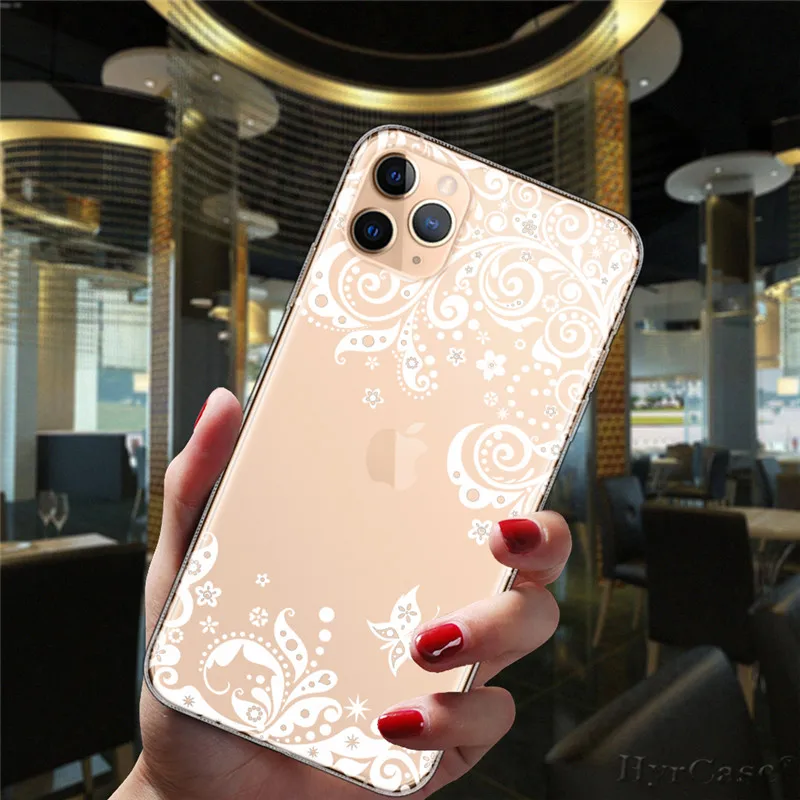 Para iPhone 13 12 11 14 Pro Max Mini 15 Plus 15ProMax funda blanca Sexy Floral Vintage encaje flor transparente funda de silicona