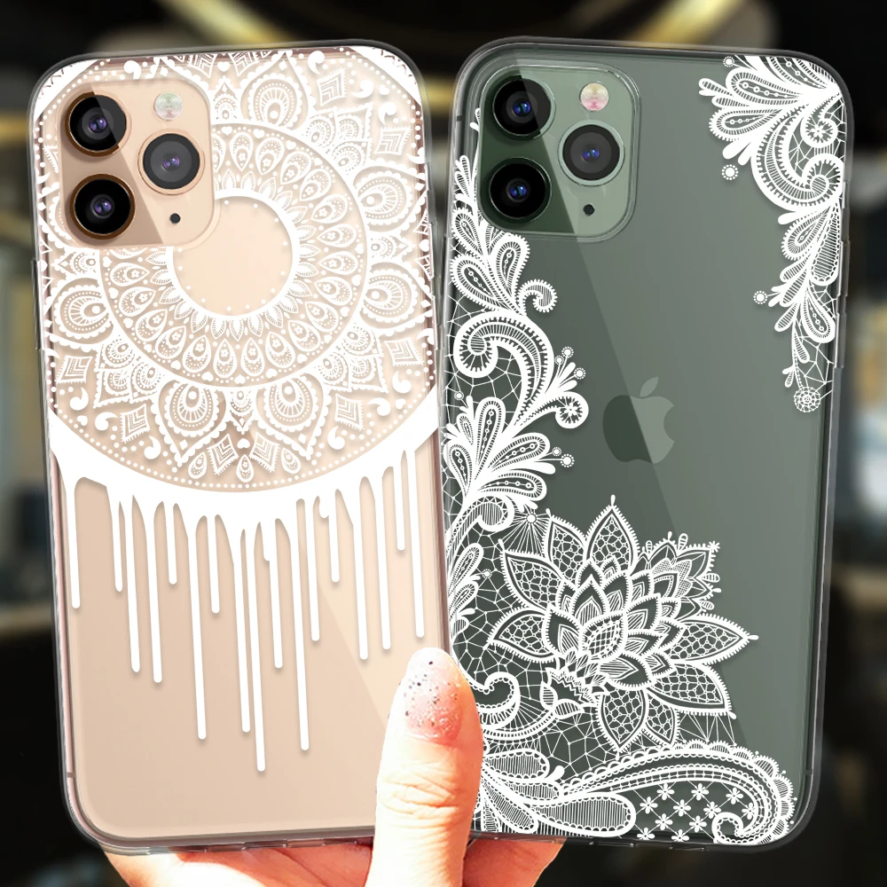 Comprar Funda de silicona transparente para iPhone 13, 12, 11, 14 Pro Max, Mini, 15 Plus, 15Pro Max, flor de encaje, Floral, Vintage, blanco, Sexy