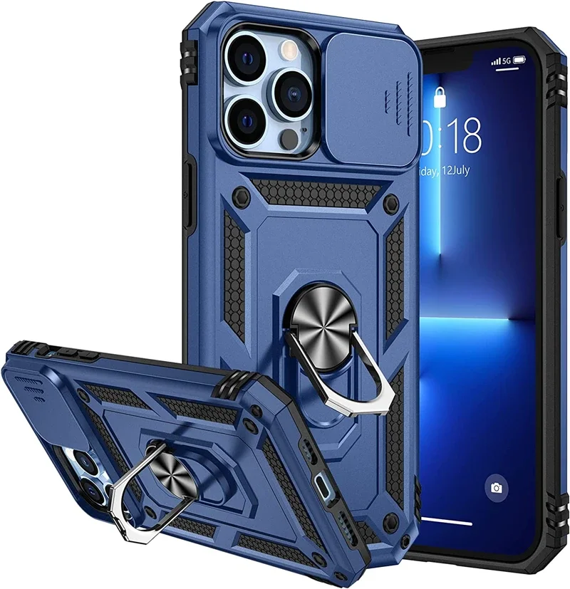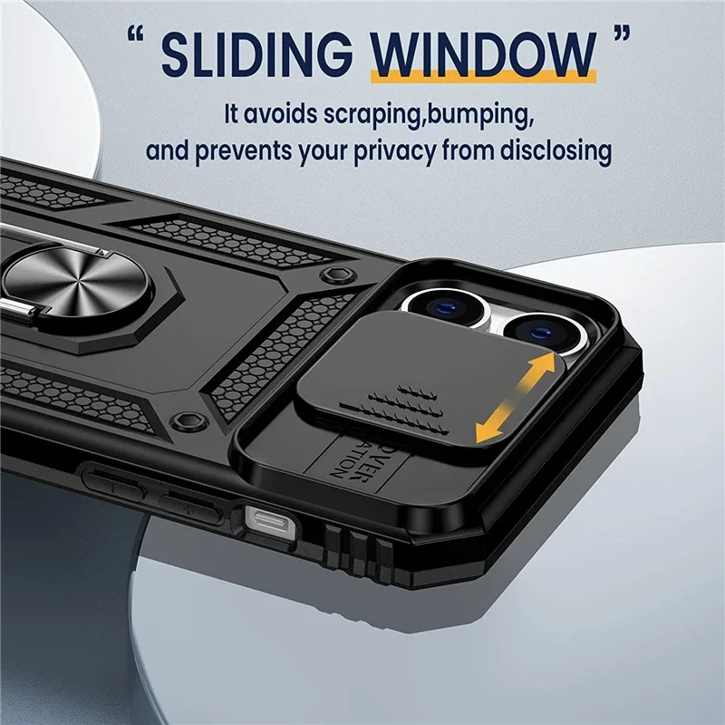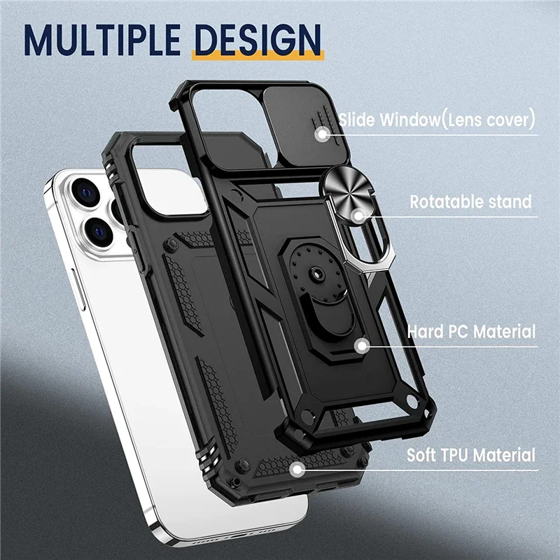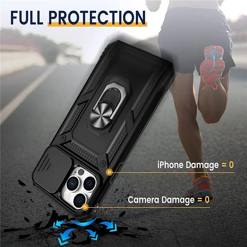 Funda con soporte de armadura de grado militar para IPhone 16 15 14 13 11 Pro Max Plus 12 Mini XS XR soporte magnético para coche con cubierta deslizante para cámara