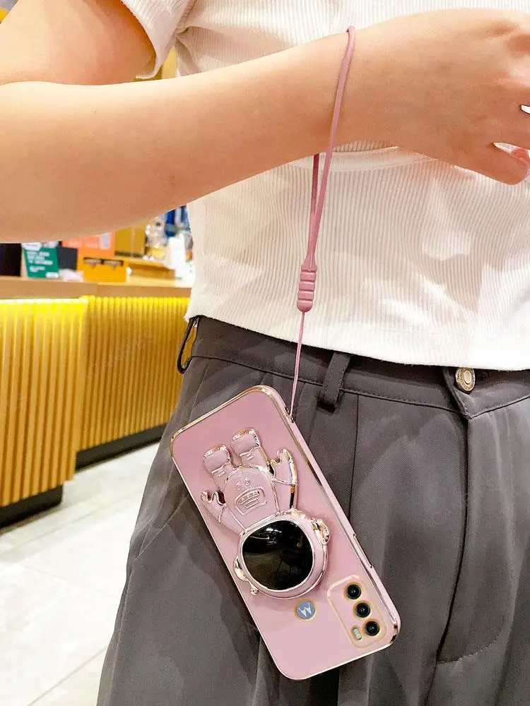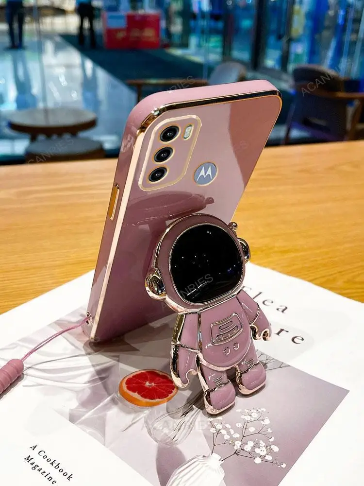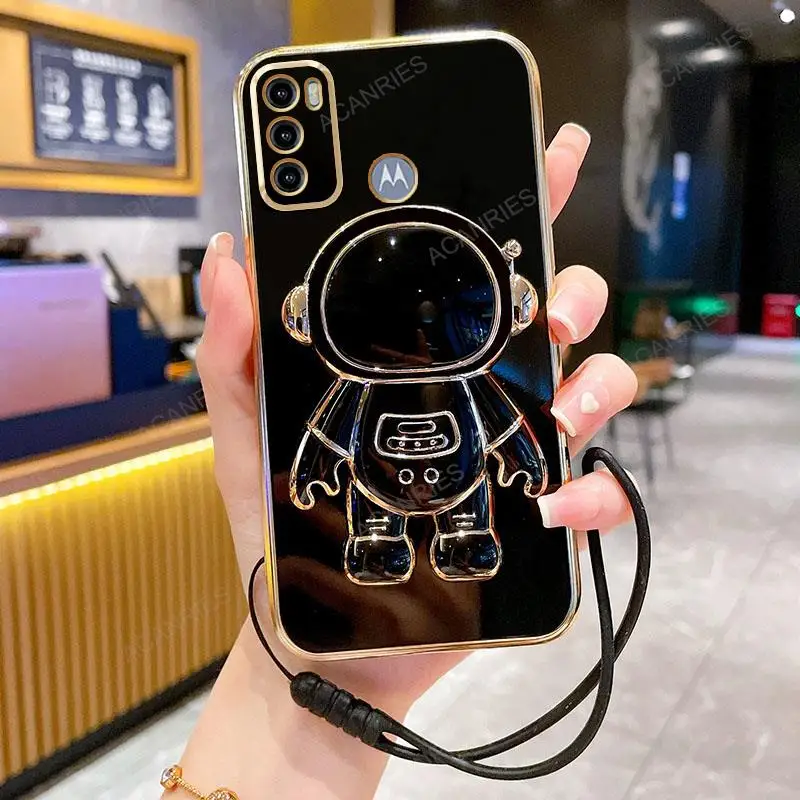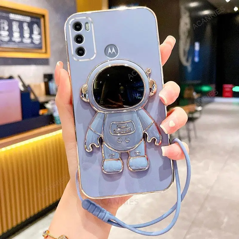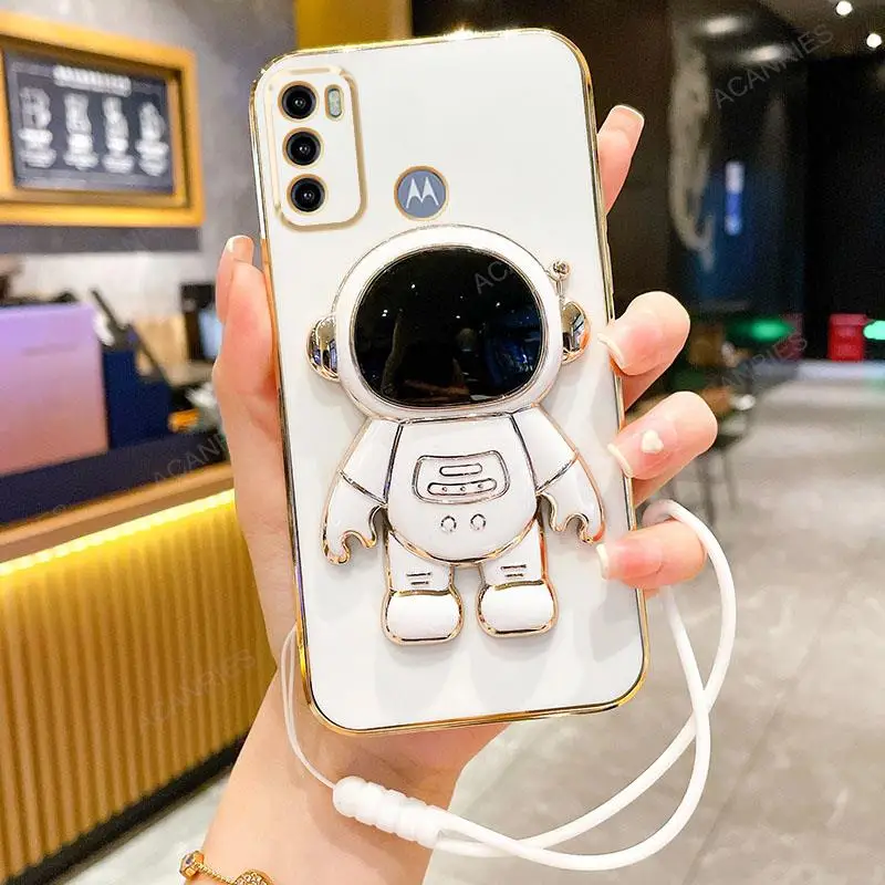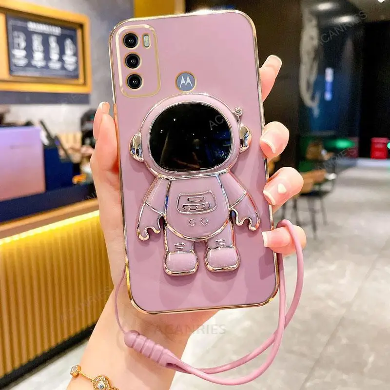 Motog60 Astronaut Holder Lanyard Plating Case para Motorola Moto G60 G50 4G 5g G10 G30 Stand Cover G20 G22 G52 E7 G9 Plus G8 Play