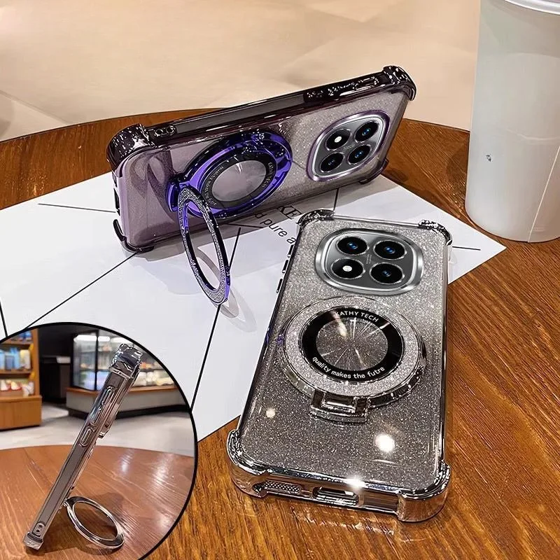 Funda con soporte magnético brillante para Xiaomi Redmi Note 14 15 Pro Plus 15 15C 14C 14S 4G 5G, funda de silicona con pulsera de cristal