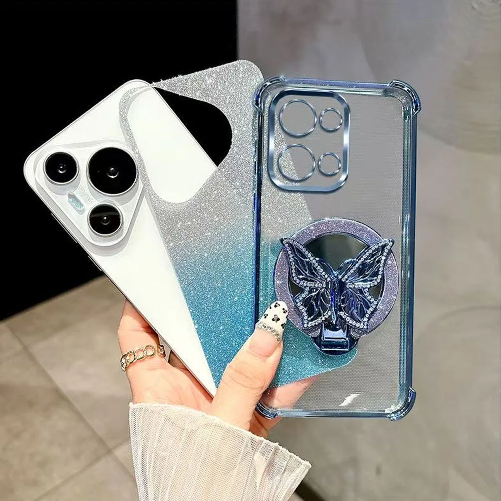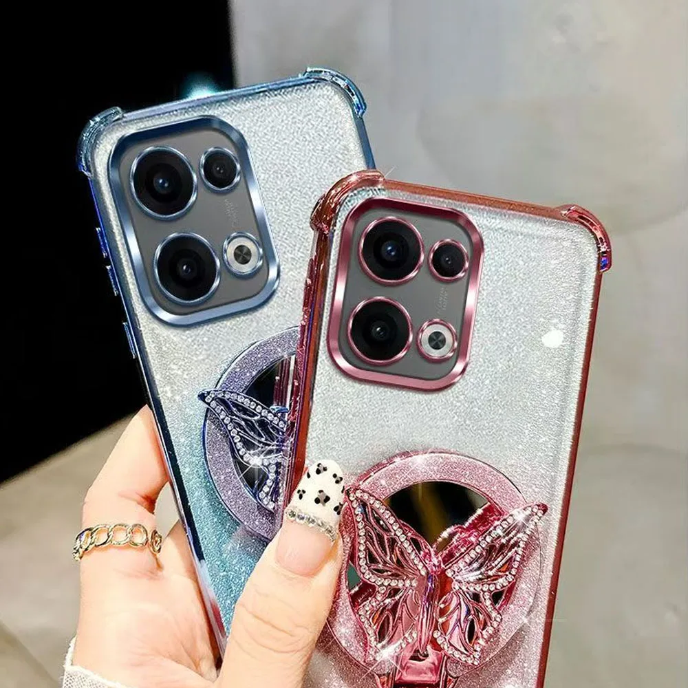 Soporte de mariposa espejo magnético+Cubierta a prueba de golpes + revestimiento transparente con purpurina