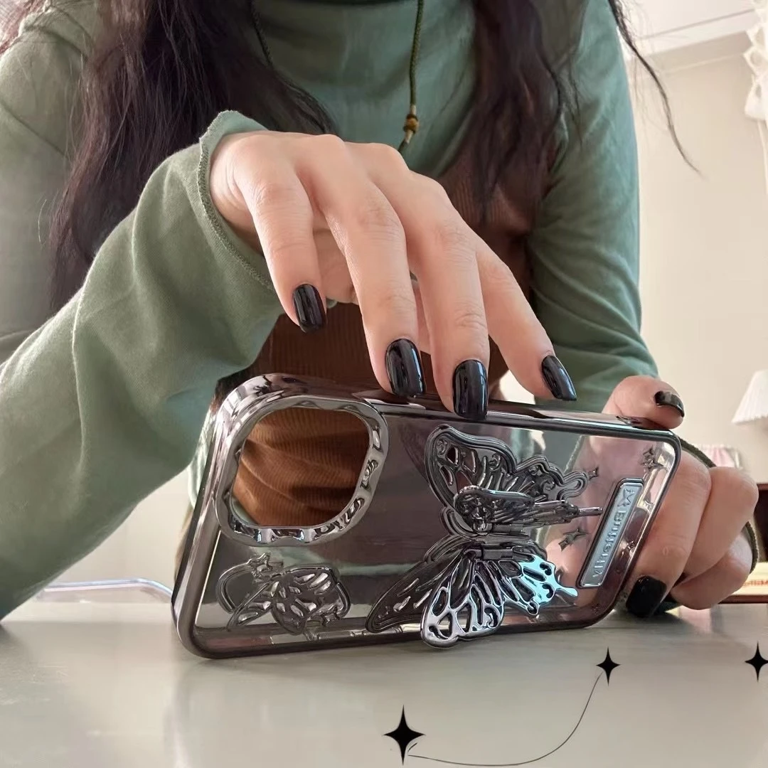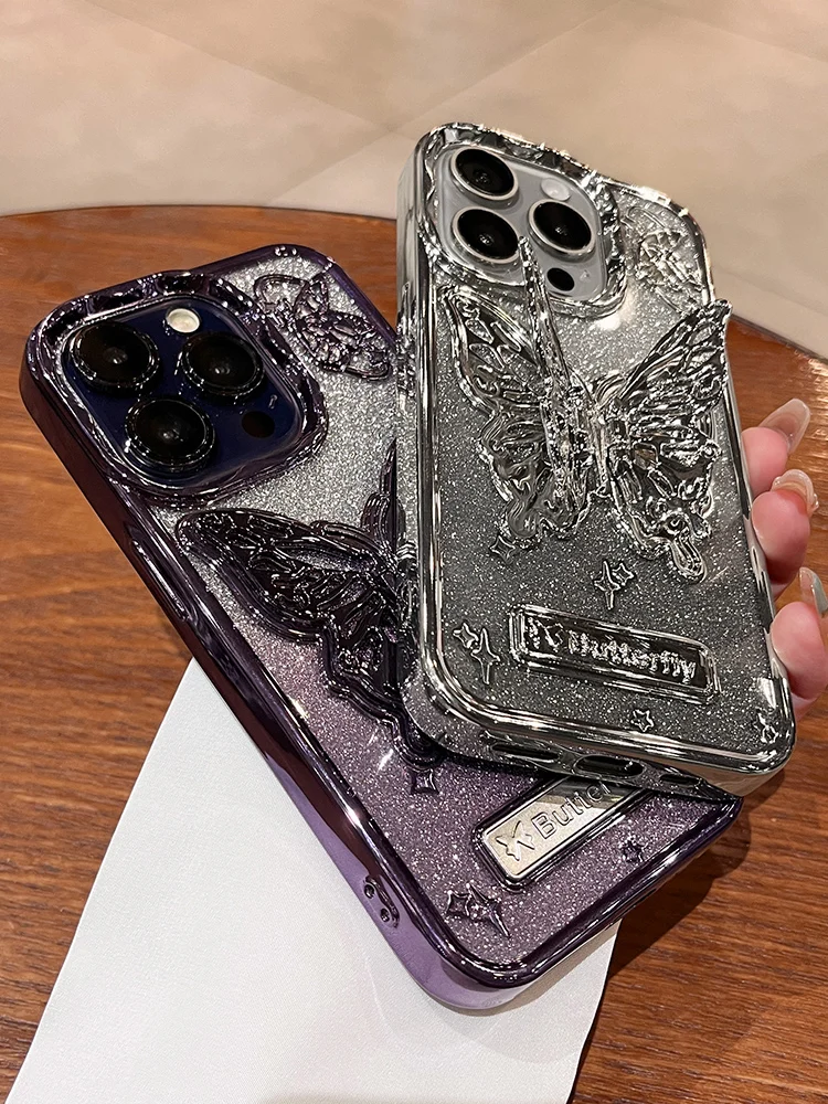 Comprar Funda con soporte de mariposa brillante para iPhone 15 14 13 Pro Max 12, cubierta suave a prueba de golpes con soporte degradado para iPhone 15ProMax