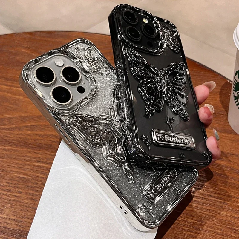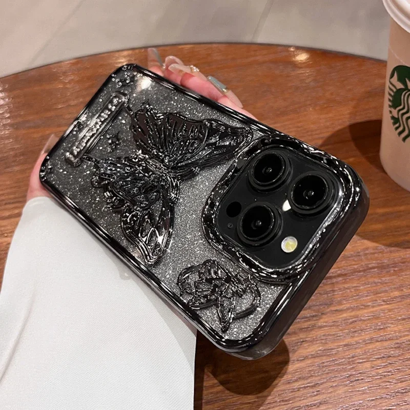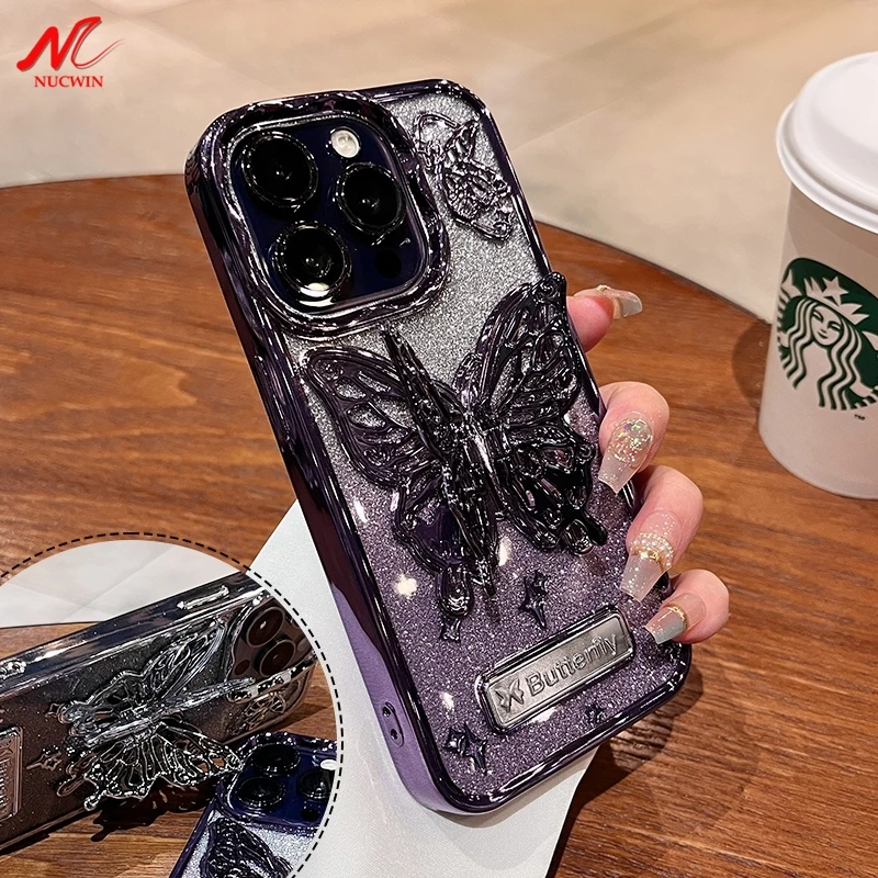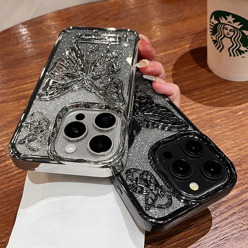 Comprar Funda con soporte de mariposa brillante para iPhone 15 14 13 Pro Max 12, cubierta suave a prueba de golpes con soporte degradado para iPhone 15ProMax