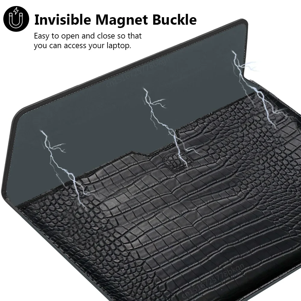 [Ultra delgado y liviano]Hecho de material de cuero PU de grano de cocodrilo resistente al agua y antiarañazos, duradero y delgado para su uso diario, protege su computadora portátil del polvo, golpes leves y rayones accidentales.Puede deslizarse fácilmente en su maletín, mochila u otro bolso.