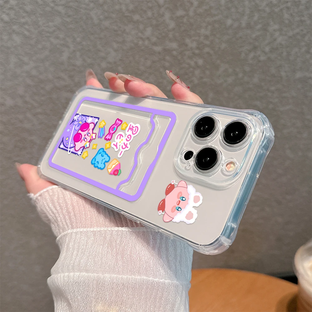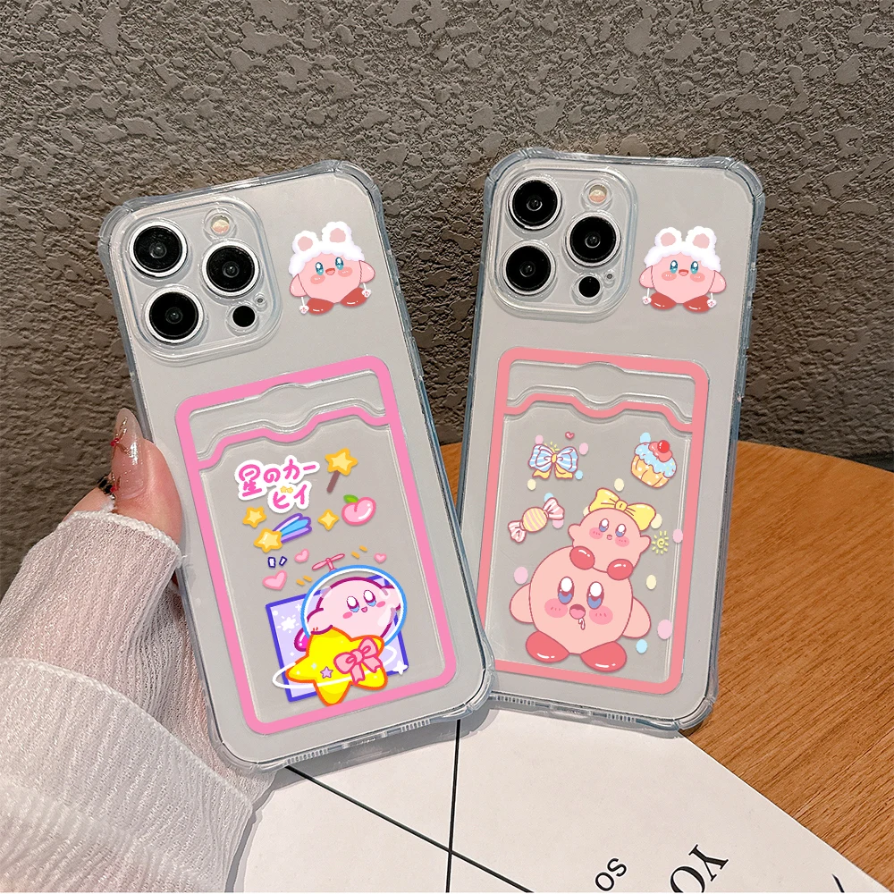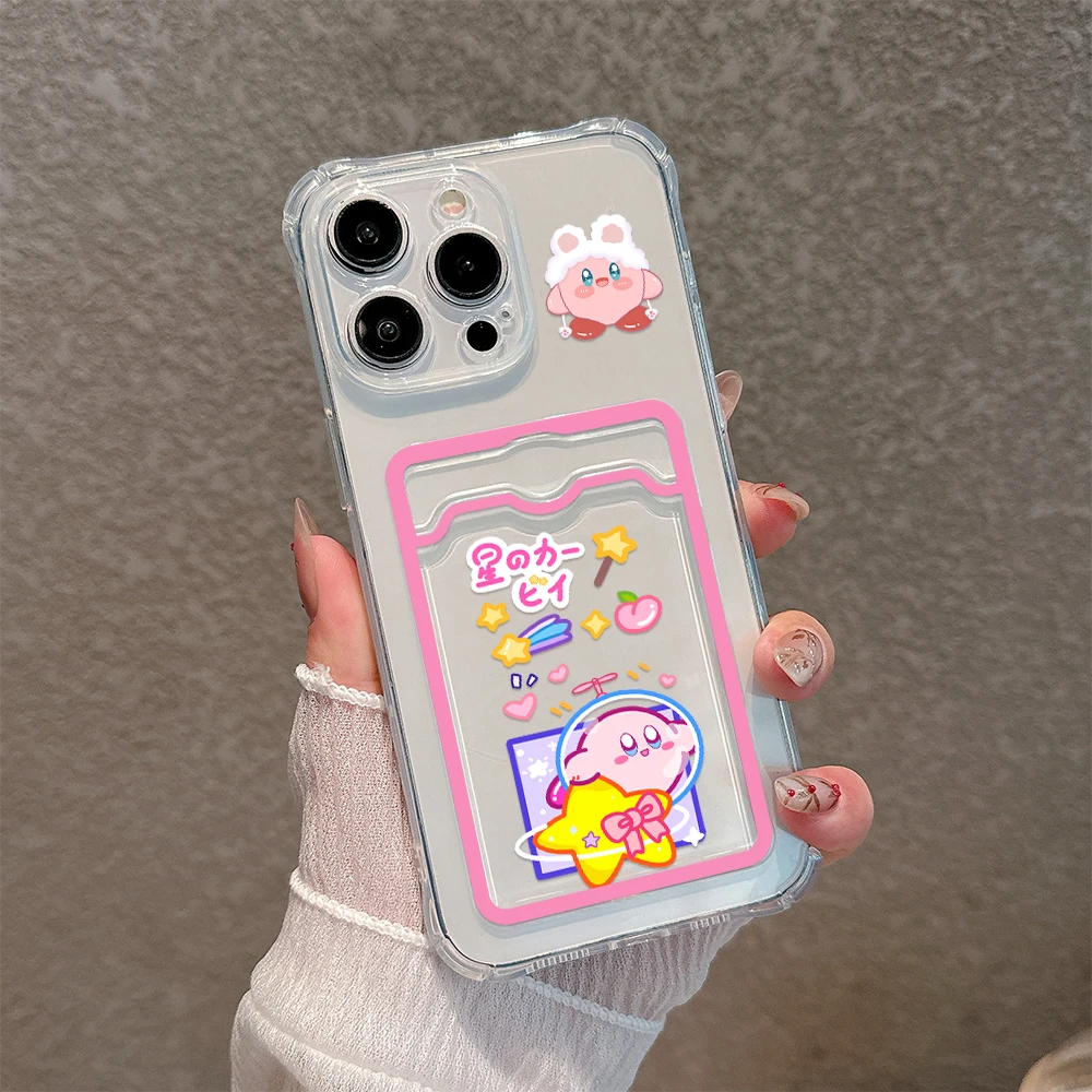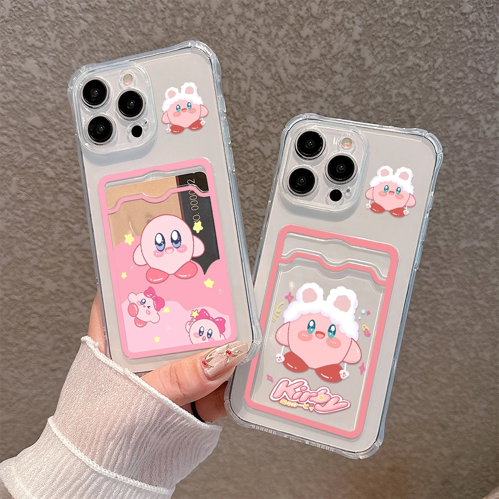 Funda con tarjetero de Kirbys rosa de anime bonito para iPhone 15 14 13 12 11 Mini Pro Max X XR XSMax 6S 6 7 8 Plus SE20 cubierta transparente anticaída