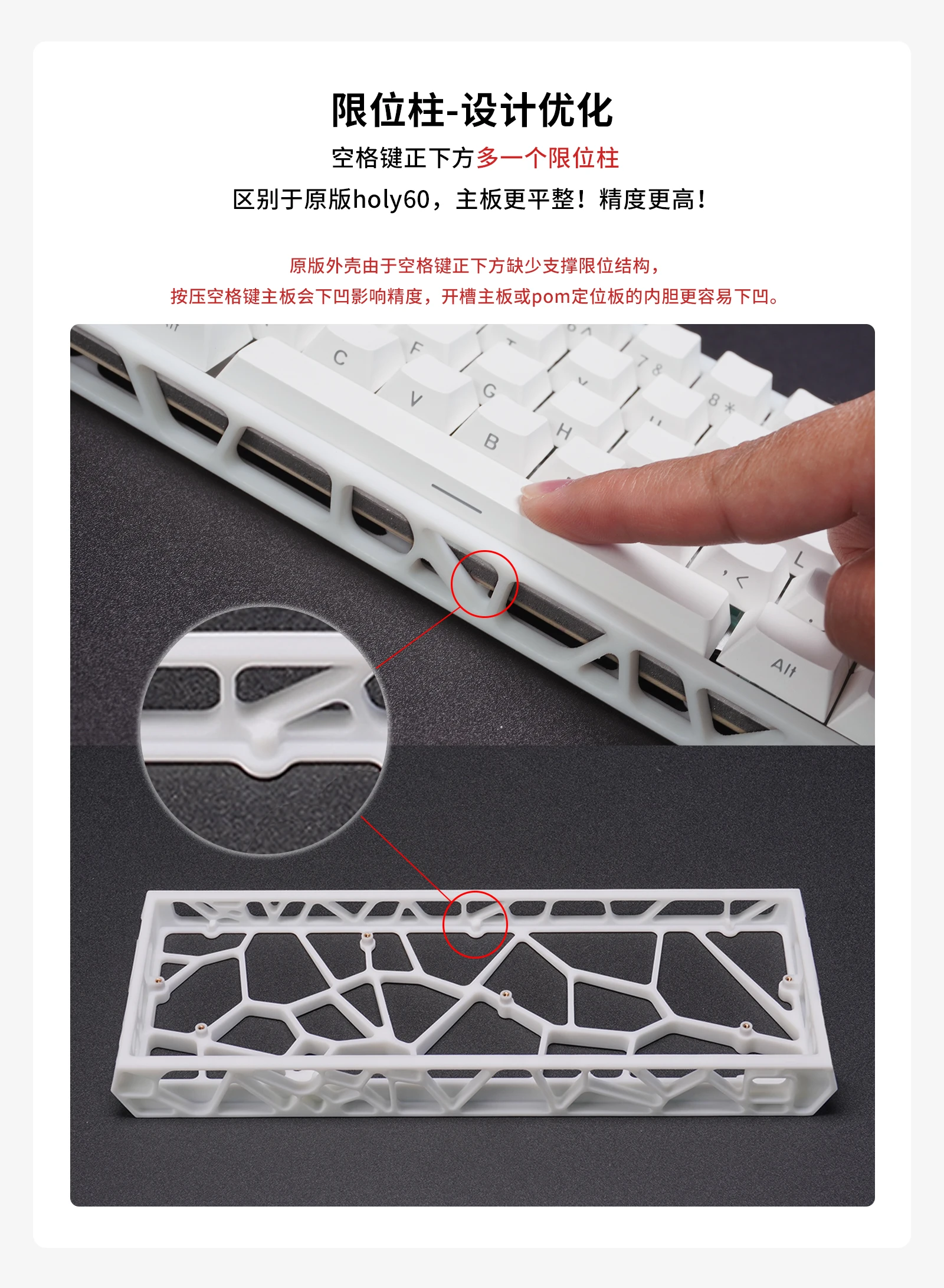 Limite de columna-Optimización del diseño Un post de límite más directamente debajo de la barra espacial Diferente del sagrado60 original, ¡la placa base es más plana!¡Mayor precisión!La carcasa original debido a la falta de soporte y la estructura límite directamente debajo de la barra espacial, al presionar la tecla de barra espacial afectará la precisión de la placa principal, y es más probable que el contenedor interior de la placa principal ranurada o de la placa de posicionamiento pom se hunda..