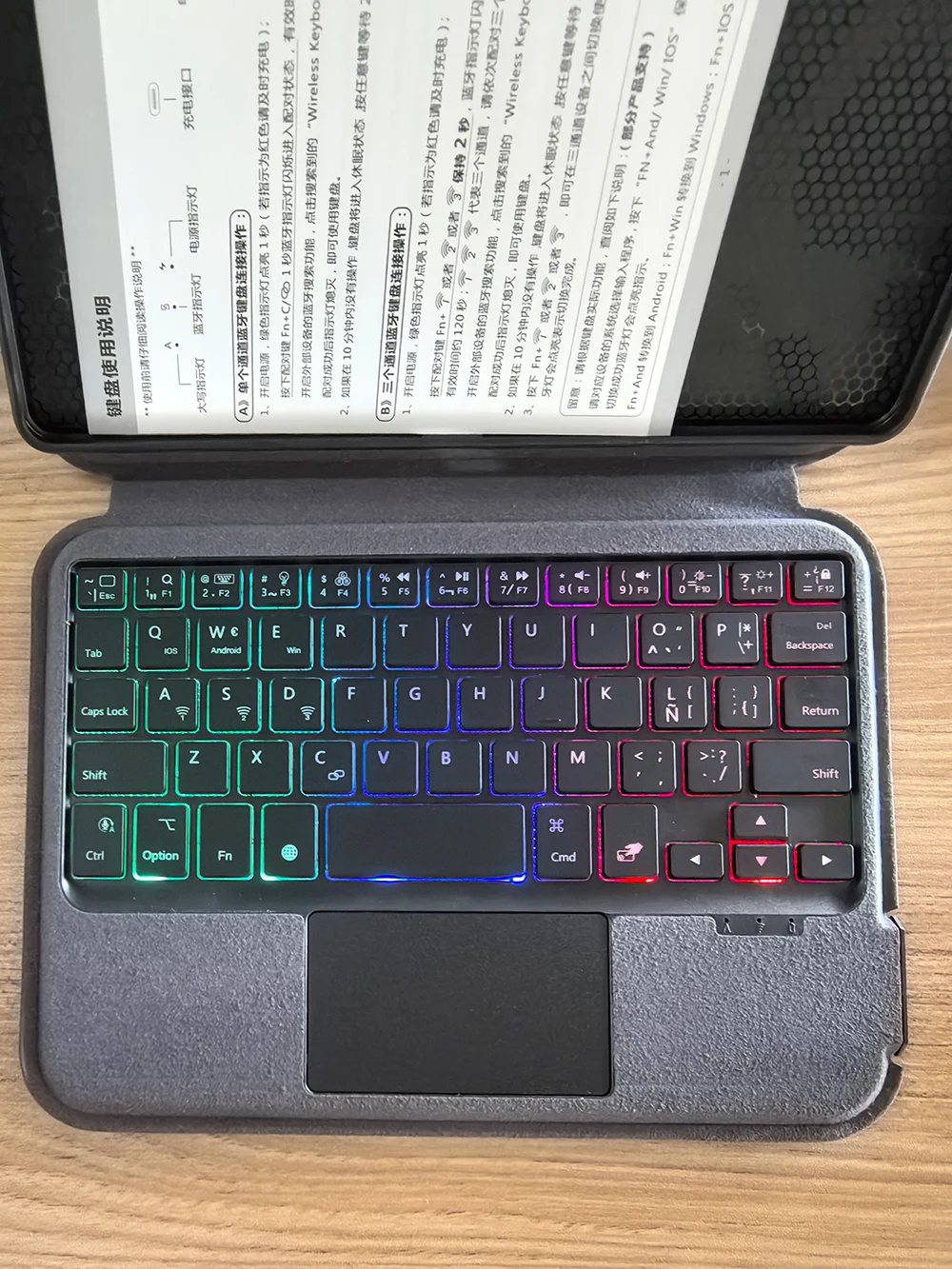 [1]Método de conexión Bluetooth: encienda el interruptor del teclado, luego presione y mantenga presionadoFn+Cdurante aproximadamente 2-3 segundos para iniciar Bluetooth.La luz indicadora se vuelve azul y luego enciende el Bluetooth de tu tableta.Busque "Teclado Bluetooth" y haga clic en conectar para emparejar.Después de recibir el teclado, cárguelo completamente (aproximadamente 4 horas).
