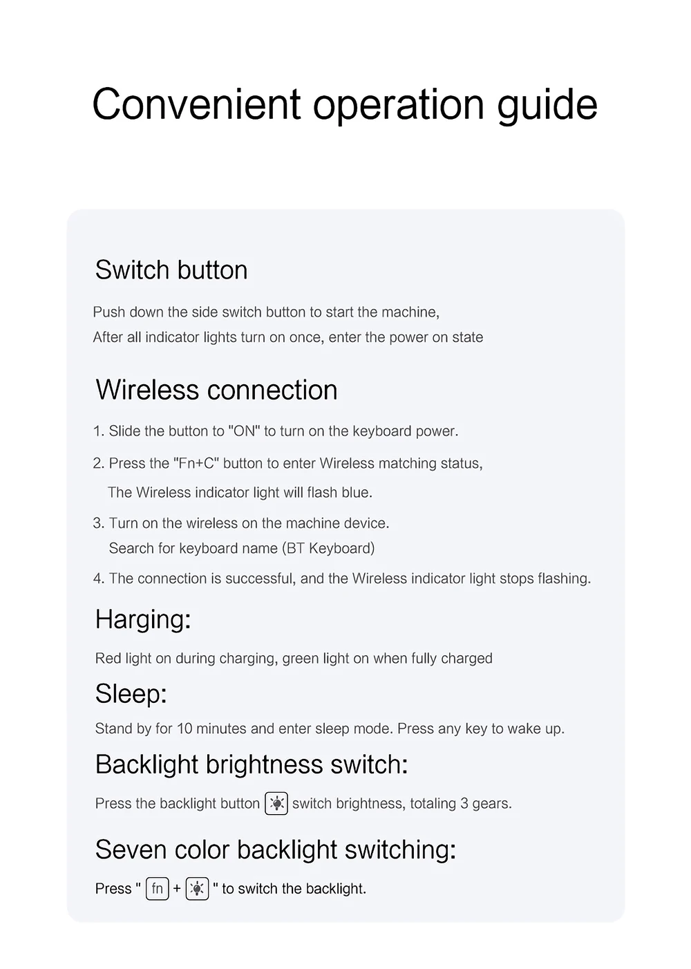 Nota 3:Encienda el interruptor del teclado, haga clic en "Fn" y "C" 【Fn+C】Botón juntos para abrir el Bluetooth del teclado.Es muy importante.