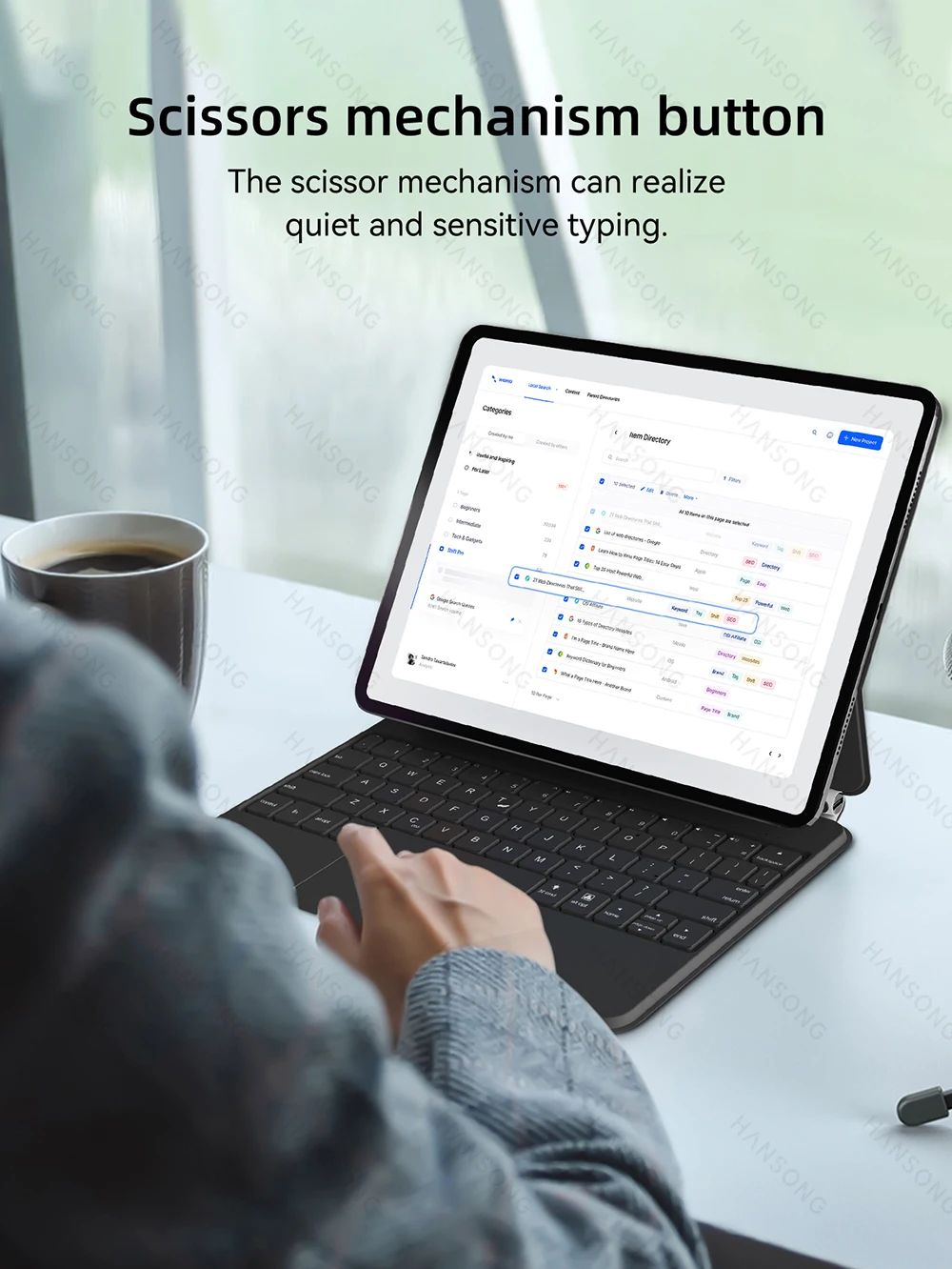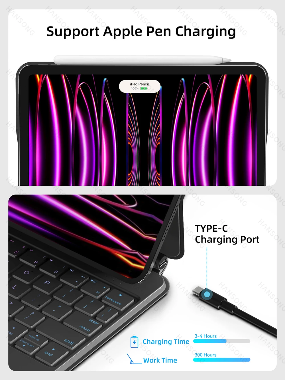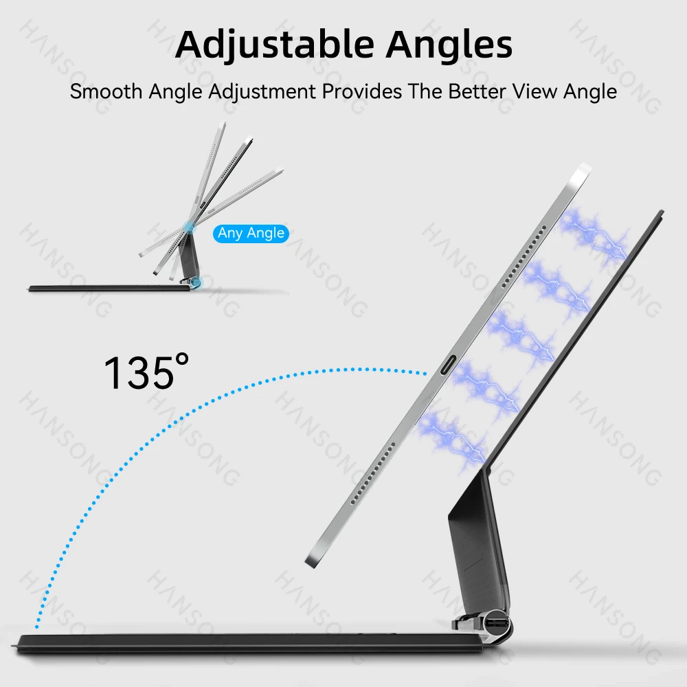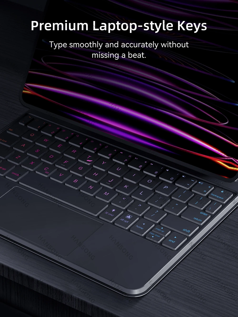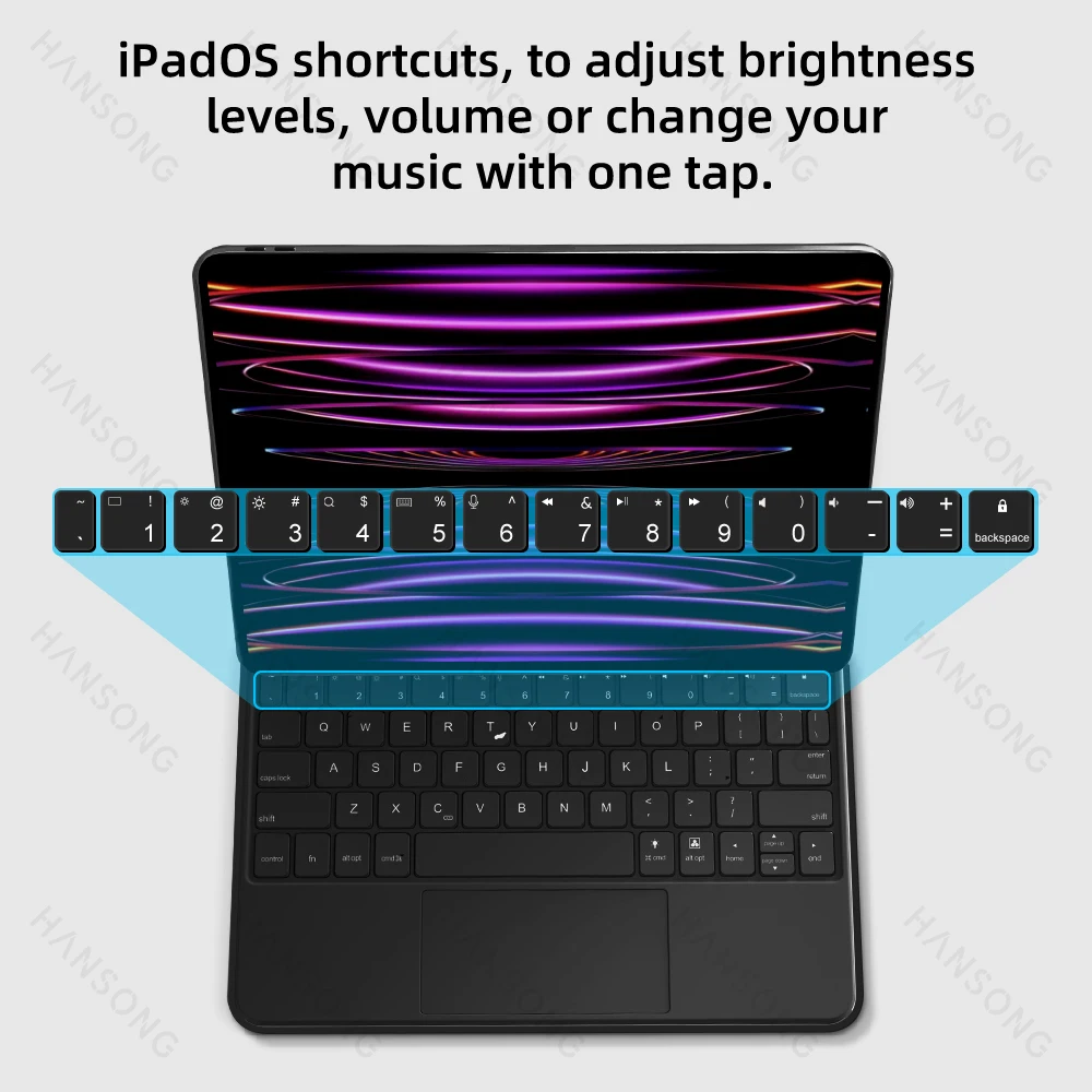 Trackpad de precisión integrado que puede navegar rápida y fácilmente por su iPad. El gesto multitáctil completo lo ayuda a desplazarse, deslizar y tocar para editar documentos, crear presentaciones y navegar por la web.