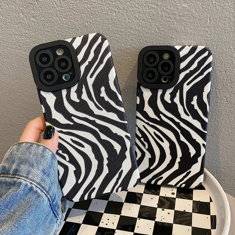 Funda de teléfono con rayas de cebra antiarrugas para iPhone 14 13 15 Pro Max 7 8 Plus X XR XS 11 12 Mini, funda completa de silicona suave a prueba de golpes