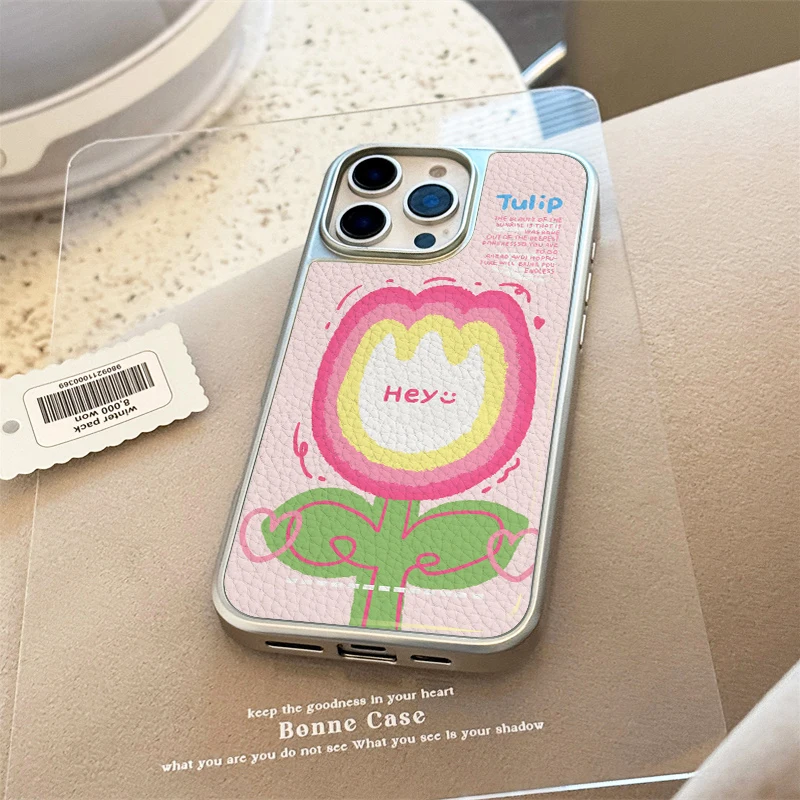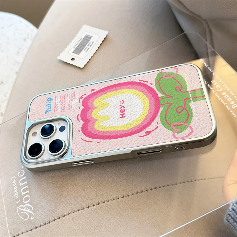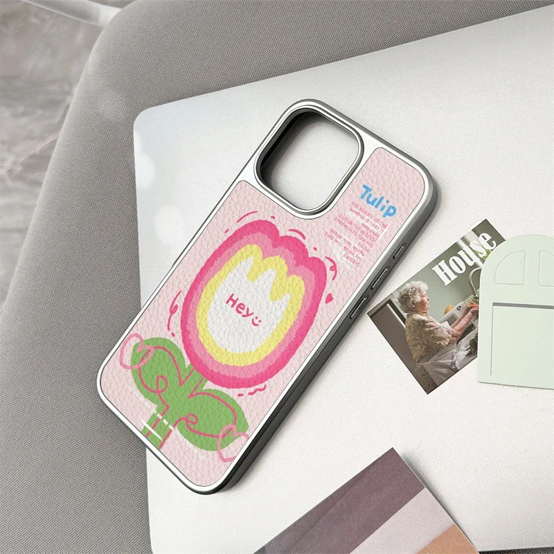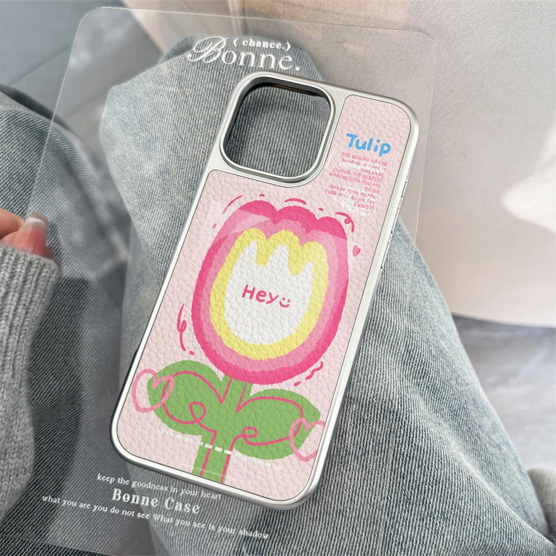 Funda de teléfono anticaída de TPU con textura de cuero de tulipán animado bonito para iPhone XR/11/12/13/14/15/16/17 Pro Max