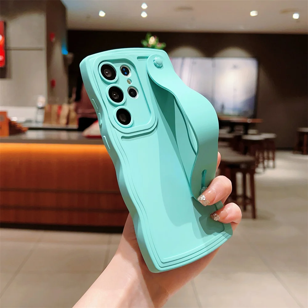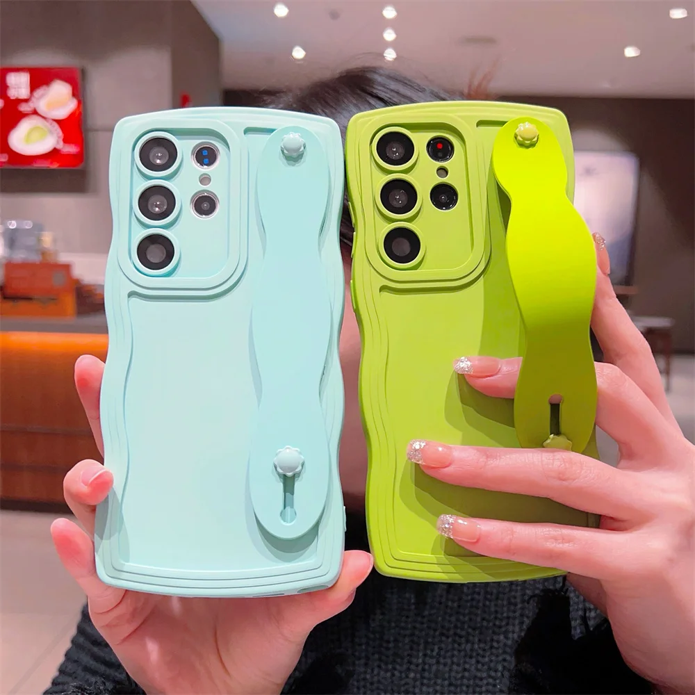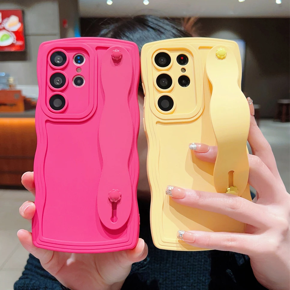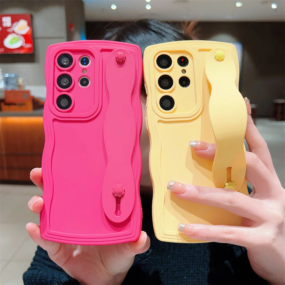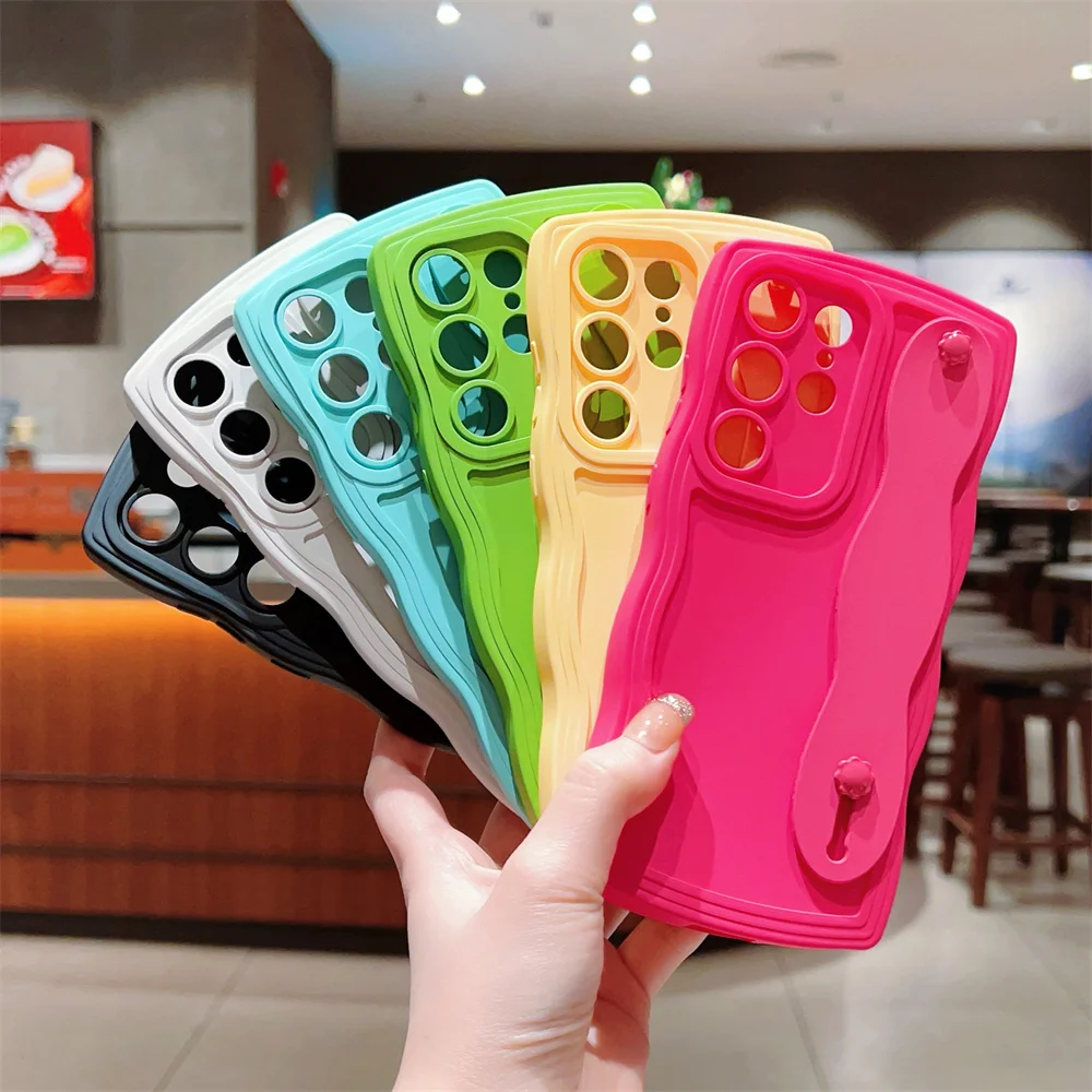 Comprar Funda de teléfono con banda de muñeca ondulada rizada para Samsung S24, S23, S22 Ultra, S21 Plus, S20 FE, A54, A34, 5G, A14, A24, A15, A53, A52, A33, A23, cubierta suave