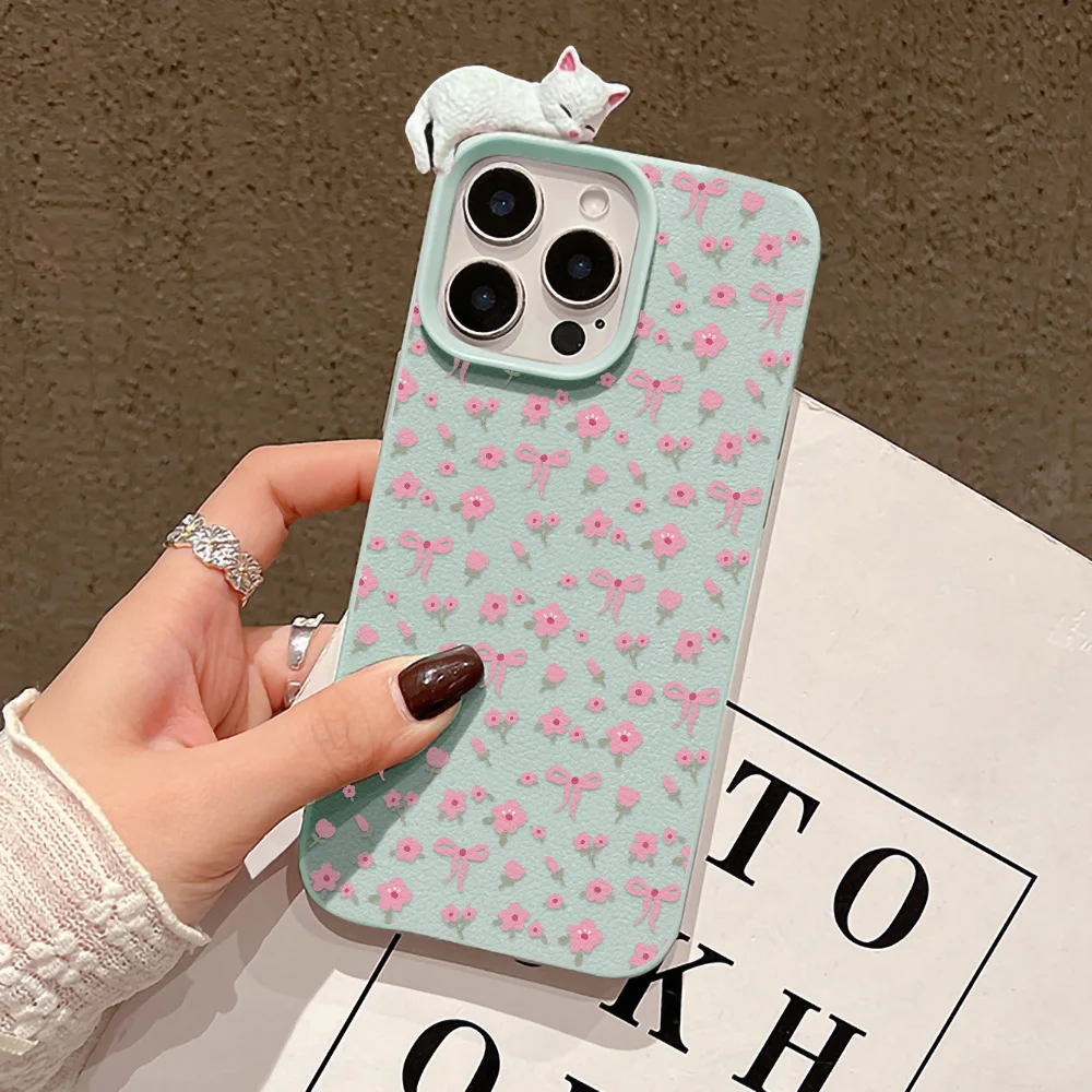 Funda de teléfono con forma de gato bonita para iPhone 17 Funda iPhone 13 11 16 Pro Max 15 14 Plus 12 Air 17promax funda de flores de cuero suave a prueba de golpes