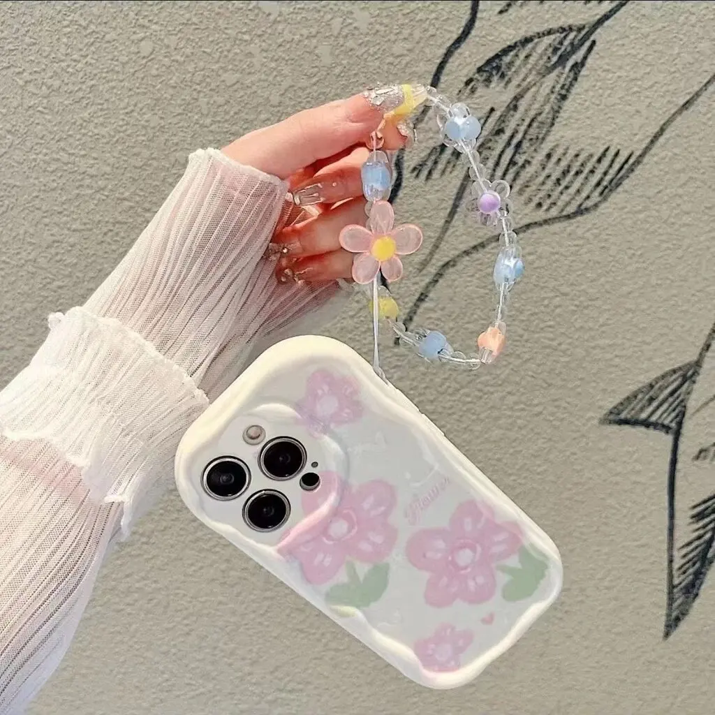 Funda de teléfono con cadena de flores y sonrisa bonita para Iphone 16 15 14 13 12 11 Pro Max 16 Plus 7 8 XR X XS 12 Mini cubierta de borde ondulado color crema - imagen 3