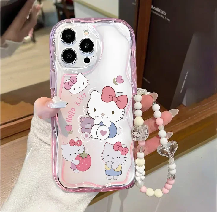 Funda de teléfono con cadena de pulsera de Hello Kitty para IPhone 15 Pro Max 14 11 12 13 Mini XR 6s 6 8 7 Plus X XS SE 2020 2022 cubierta de borde ondulado