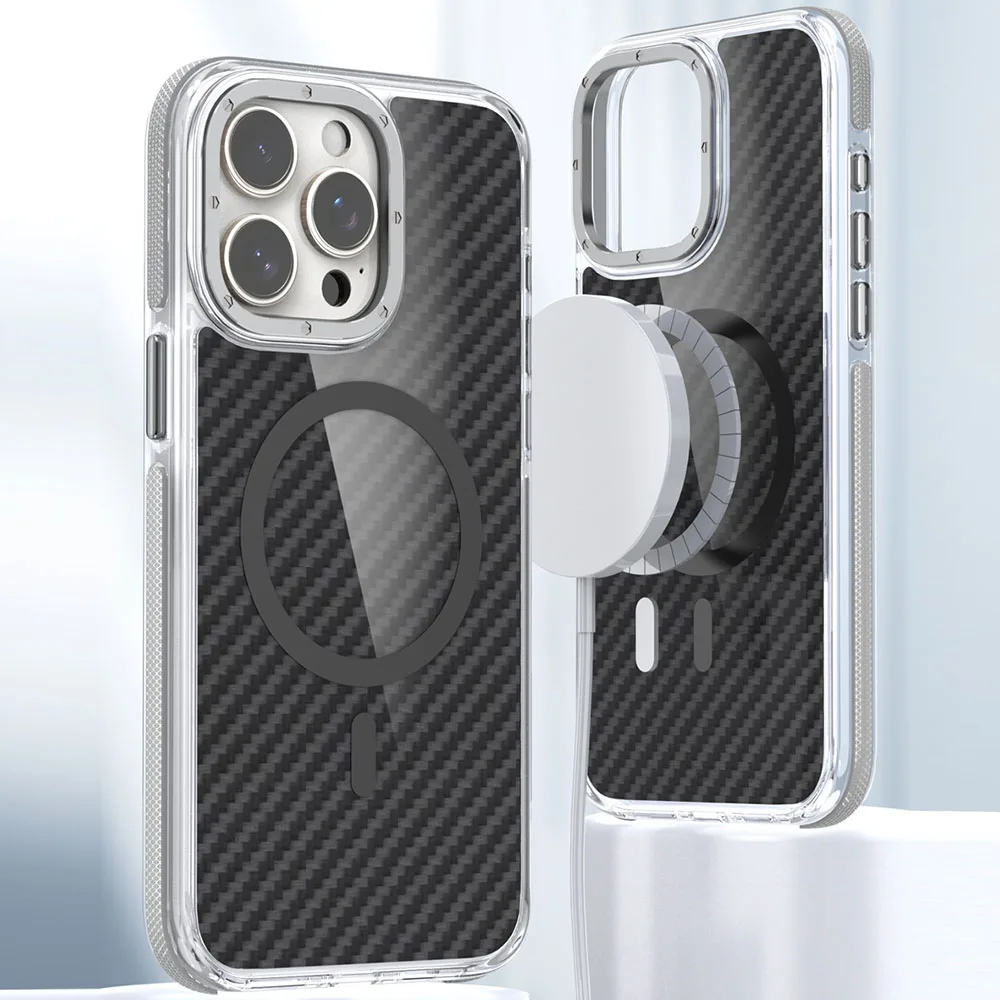 Funda de teléfono de carga inalámbrica magnética de doble Color para iPhone 11, 12, 13, 14, 15, 16 Pro Max, carcasa sísmica con patrón de fibra de carbono
