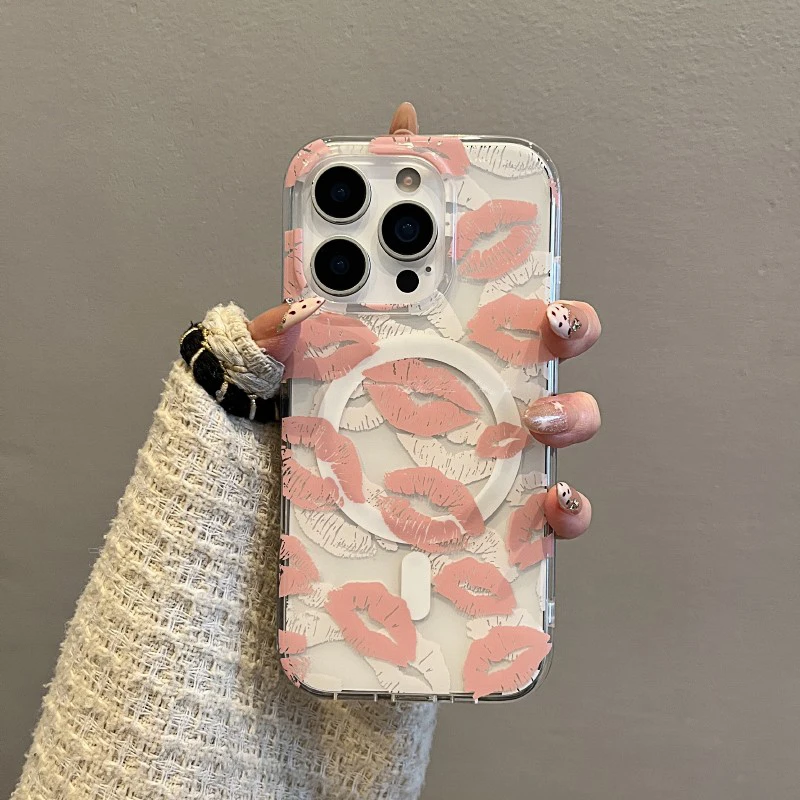 Funda de teléfono con carga inalámbrica magnética con estampado de labios rosa a la moda para iPhone 16 15 14 13 Pro Max, funda de TPU transparente para Magsafe