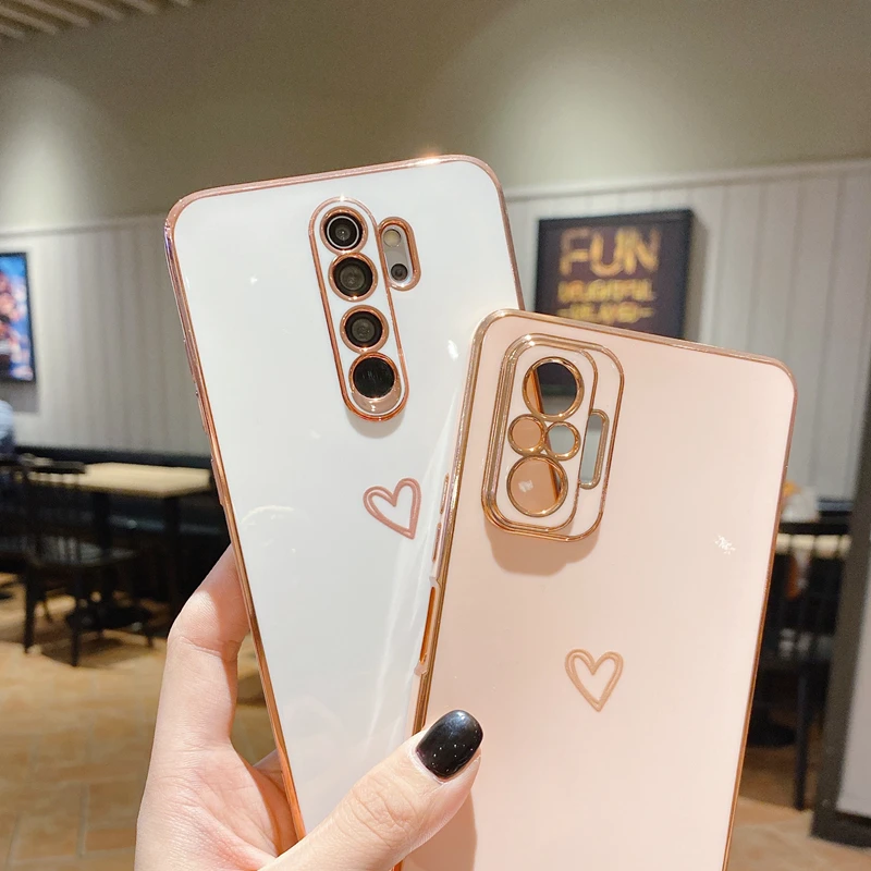Square Plating Cute Love Heart Phone Case For Xiaomi Redmi 10C 10 9 9a 9T K20 Redmi10 C Redmi Note 10 9 8 7 Pro Max Luxury Cover