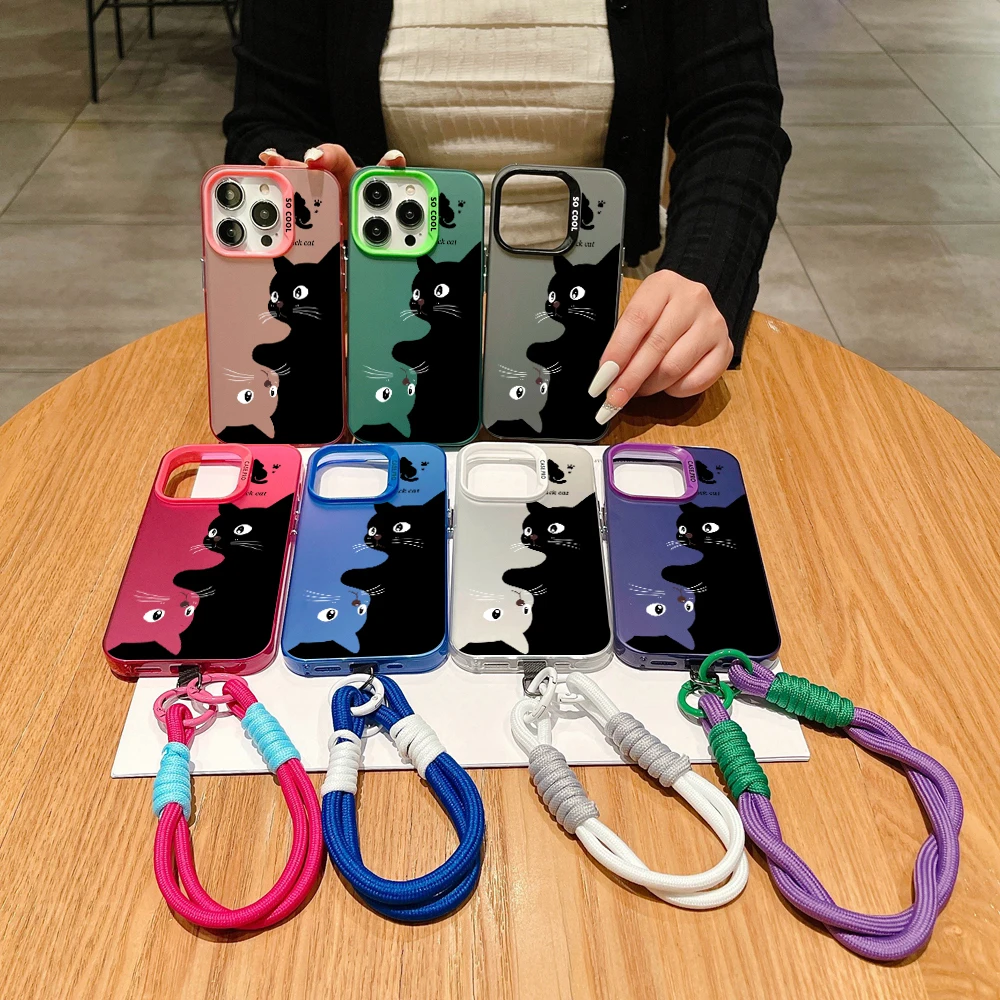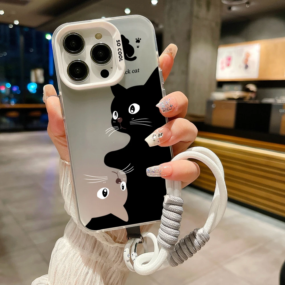 Cartoon Black Cat Lanyard Strap Phone Case For Samsung Galaxy A13 A23 A15 A35 A55 S24 S23 S22 S21 Ultra Plus S20 FE Hard Cover