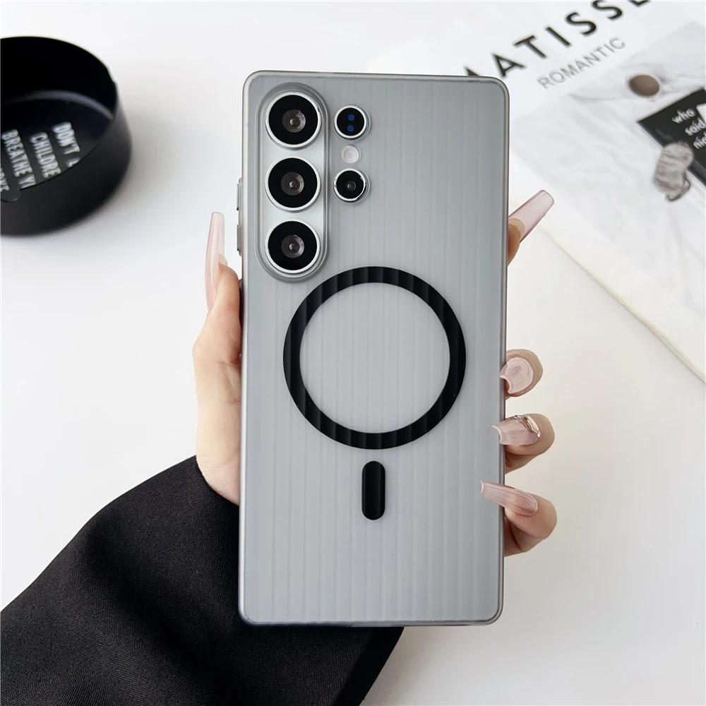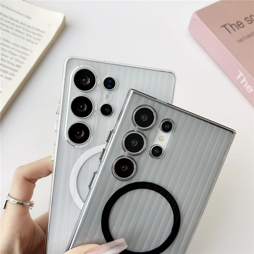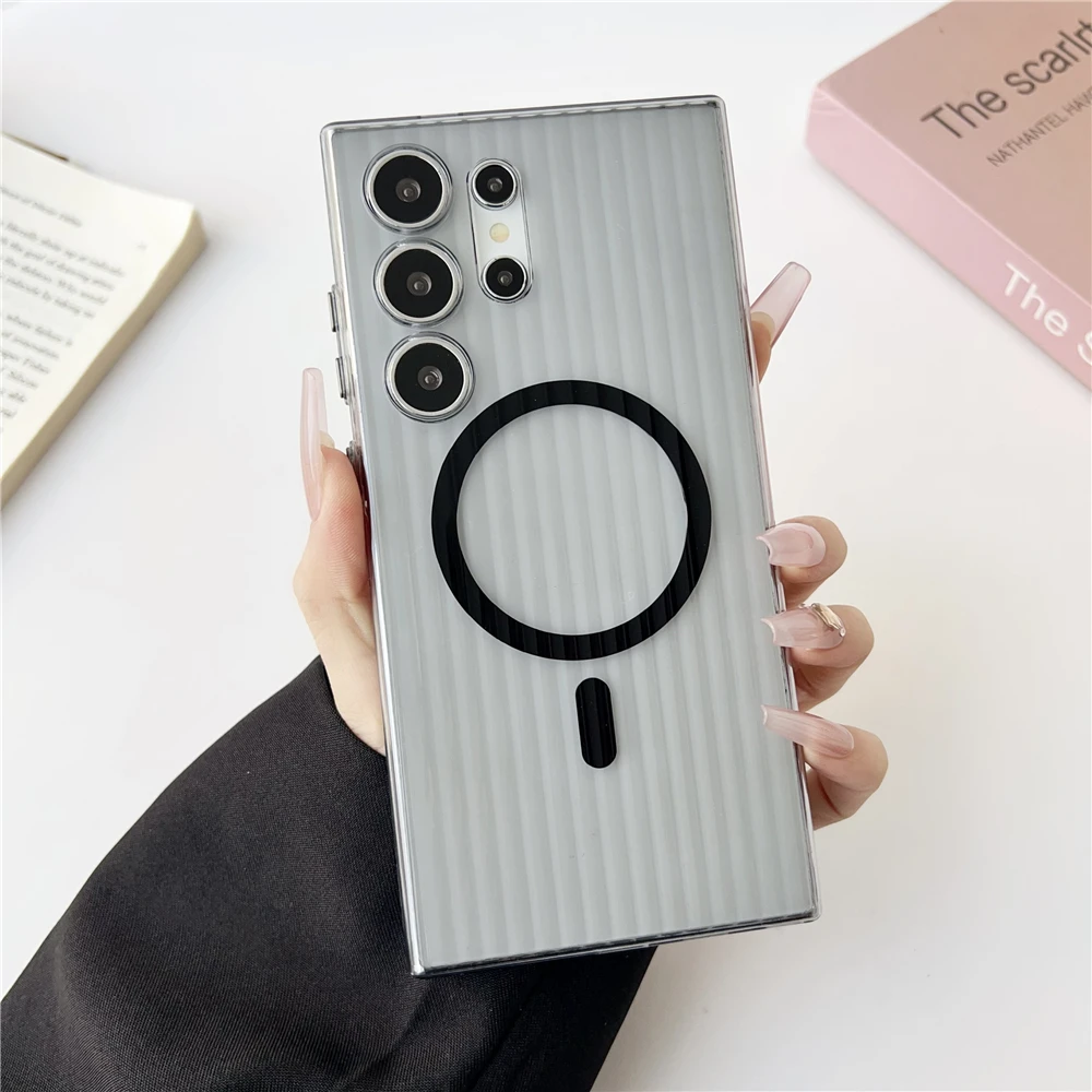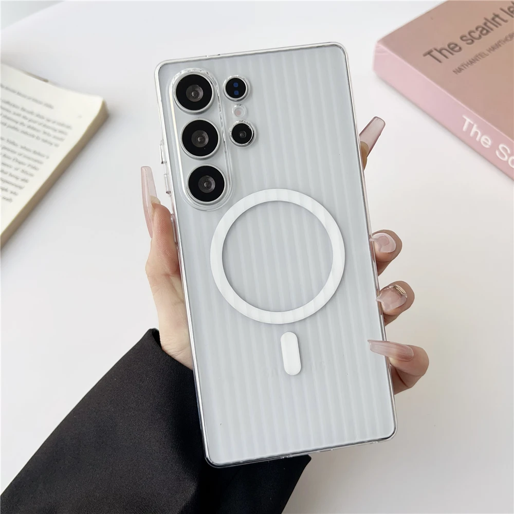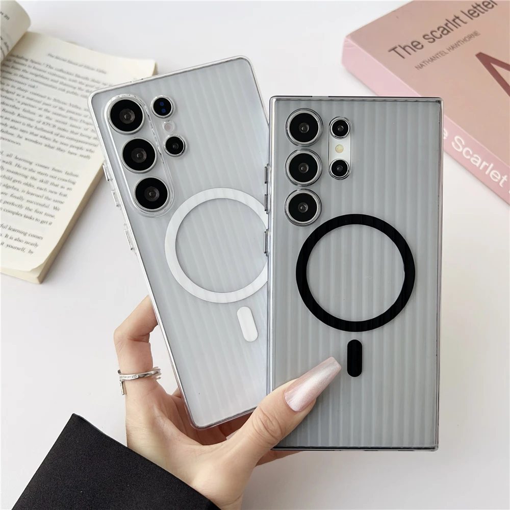 Comprar Funda de teléfono corrugada transparente mate para Magsafe Samsung Galaxy S25 Ultra S24 S23 Plus cubierta magnética de carga Ultra inalámbrica