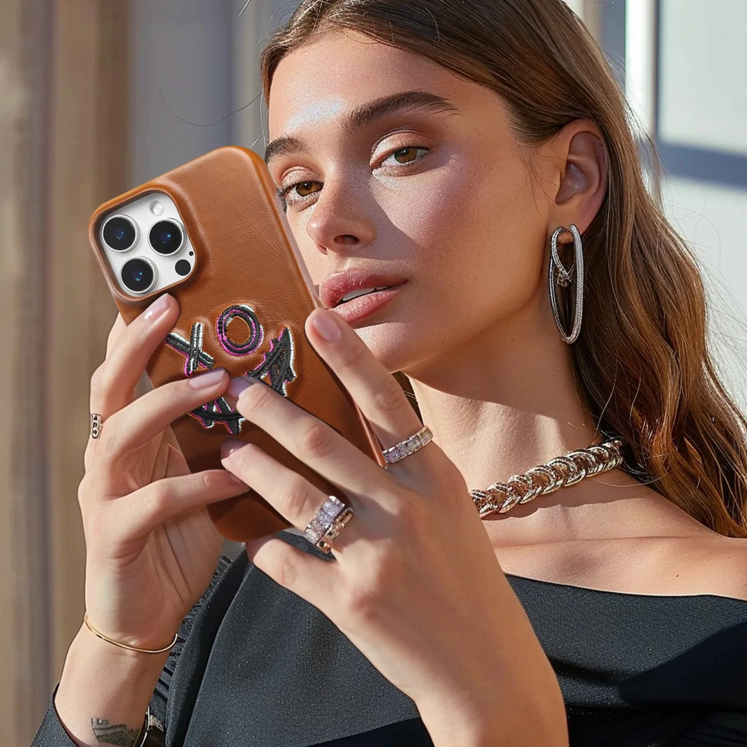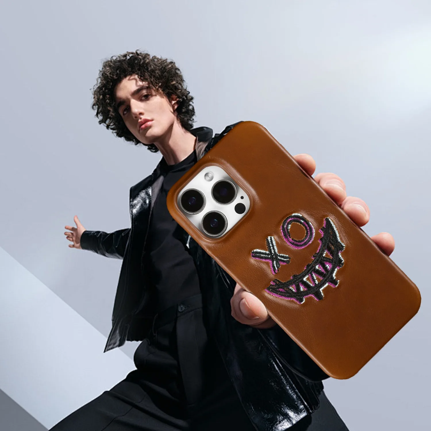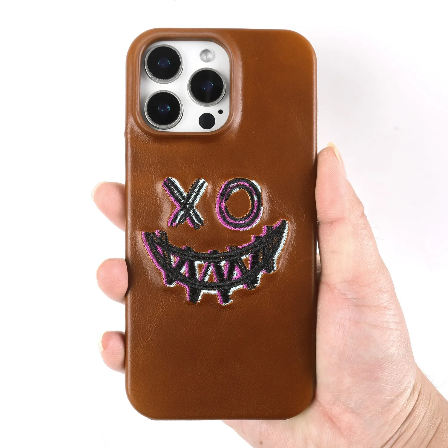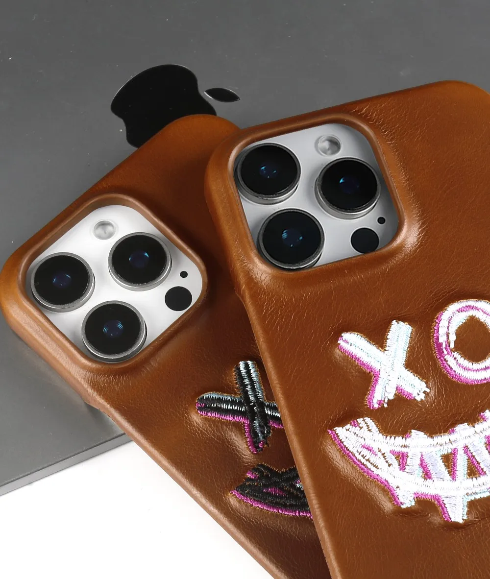 Funda de teléfono de cuero genuino con bordado Retro para Iphone 16 Pro Max, fundas 15 13pro 14 12 11, funda protectora trasera Vintage estética