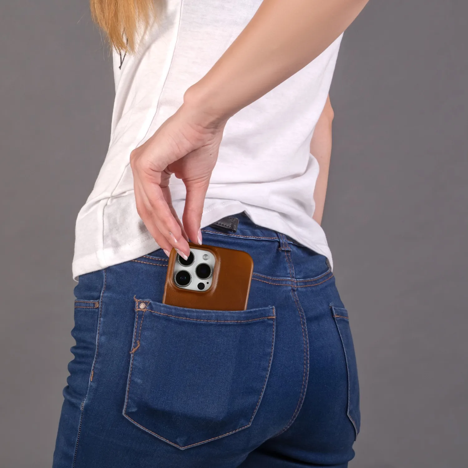 La lujosa funda de cuero genuino tiene bordes elevados alrededor de la cámara y la pantalla para ayudar a proteger contra rasguños.