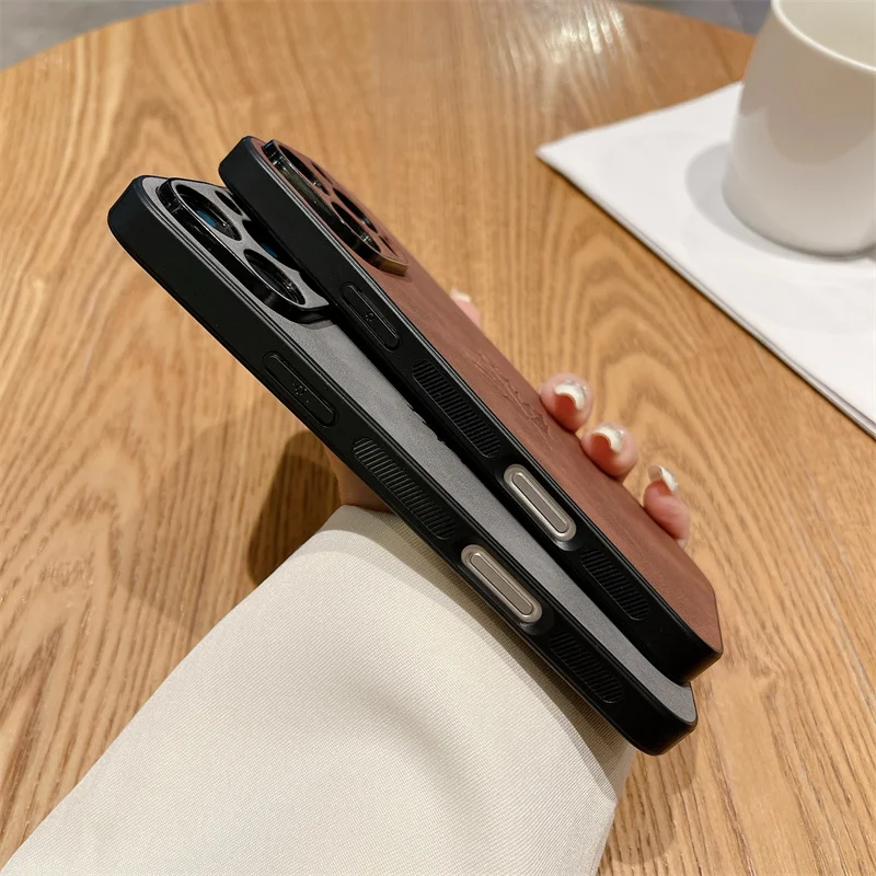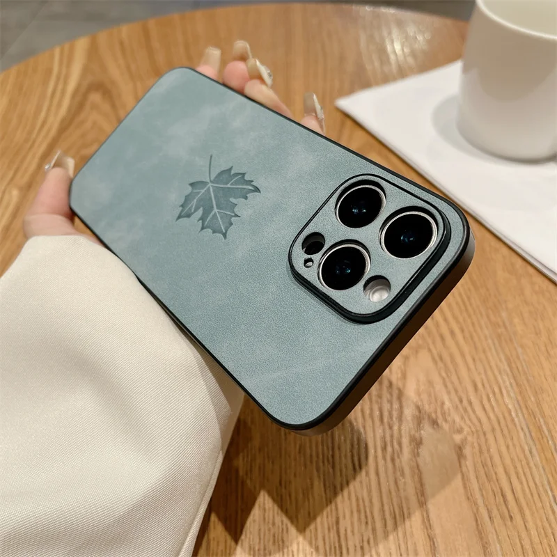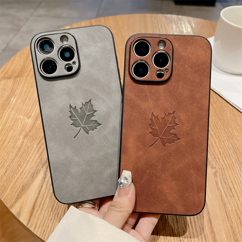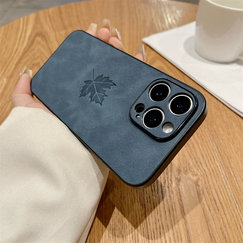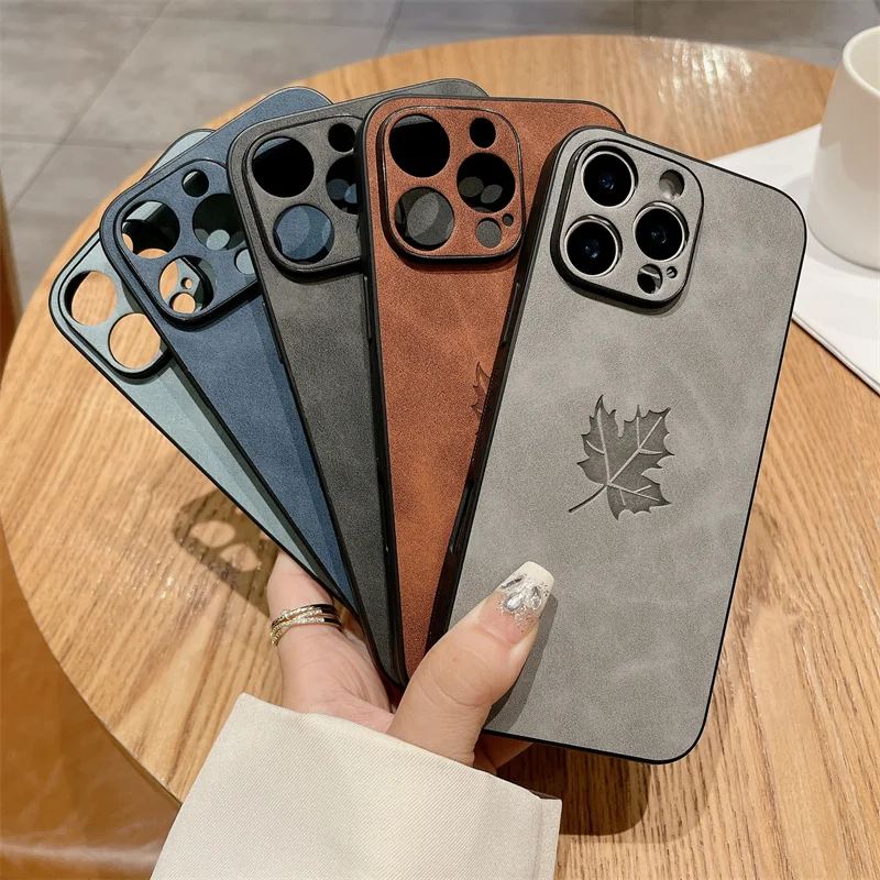 Funda de teléfono de cuero de hoja para iPhone 16 16E 15 14 Plus 13 12 11 Pro Max X XS Max XR cubierta trasera dura de PC a prueba de golpes