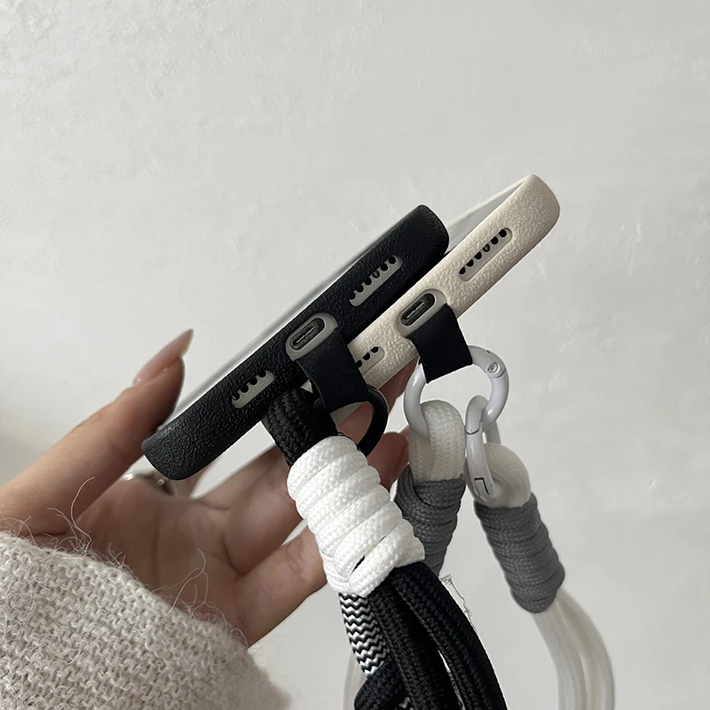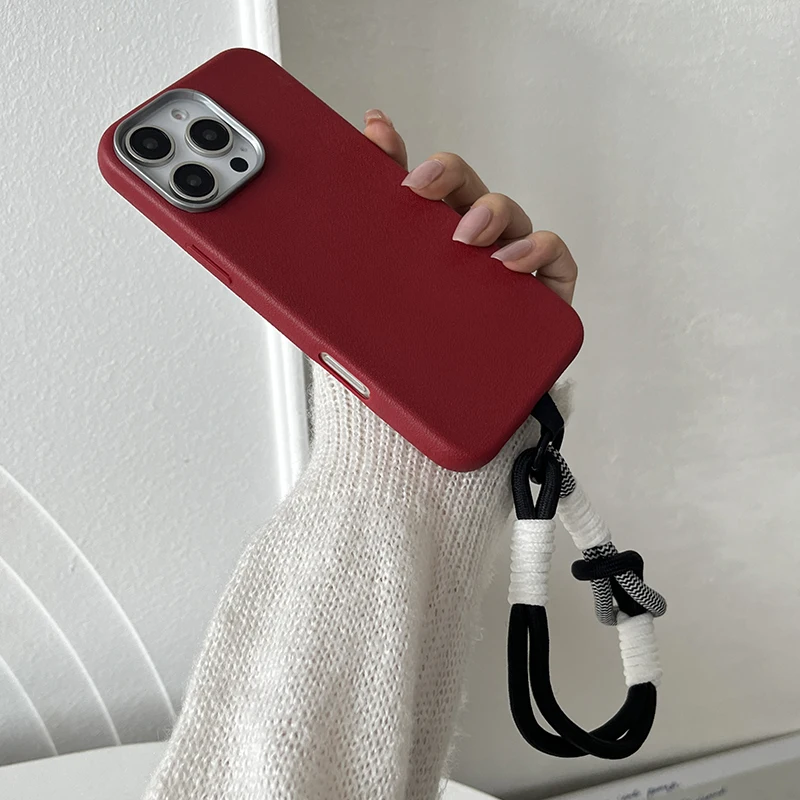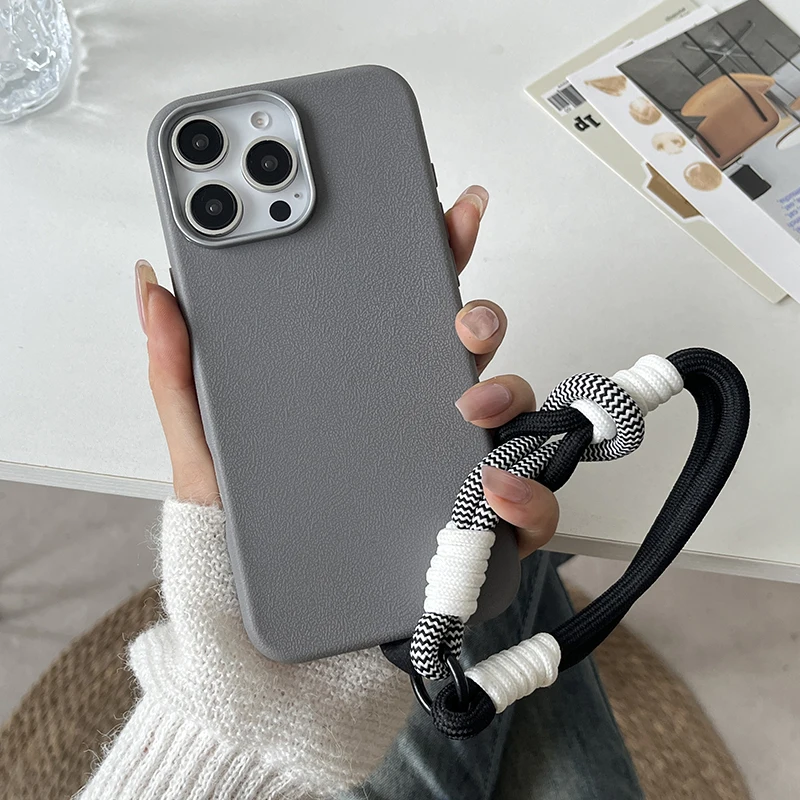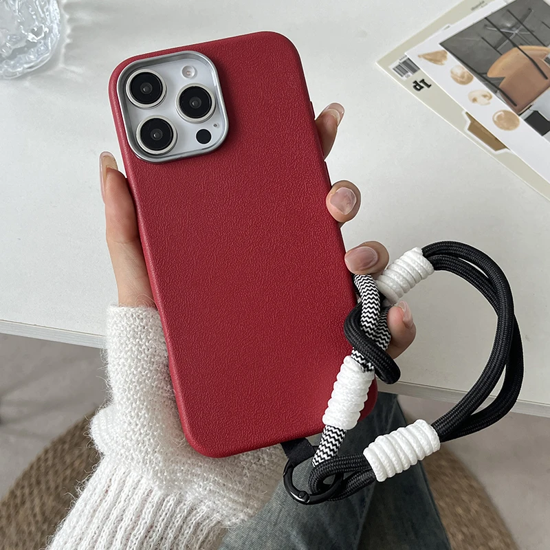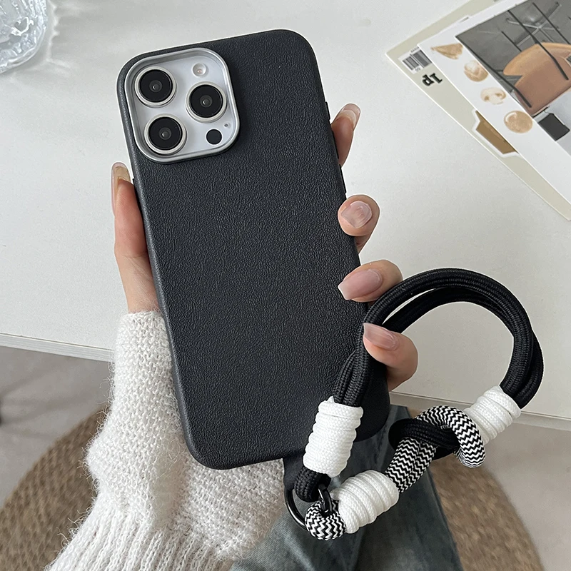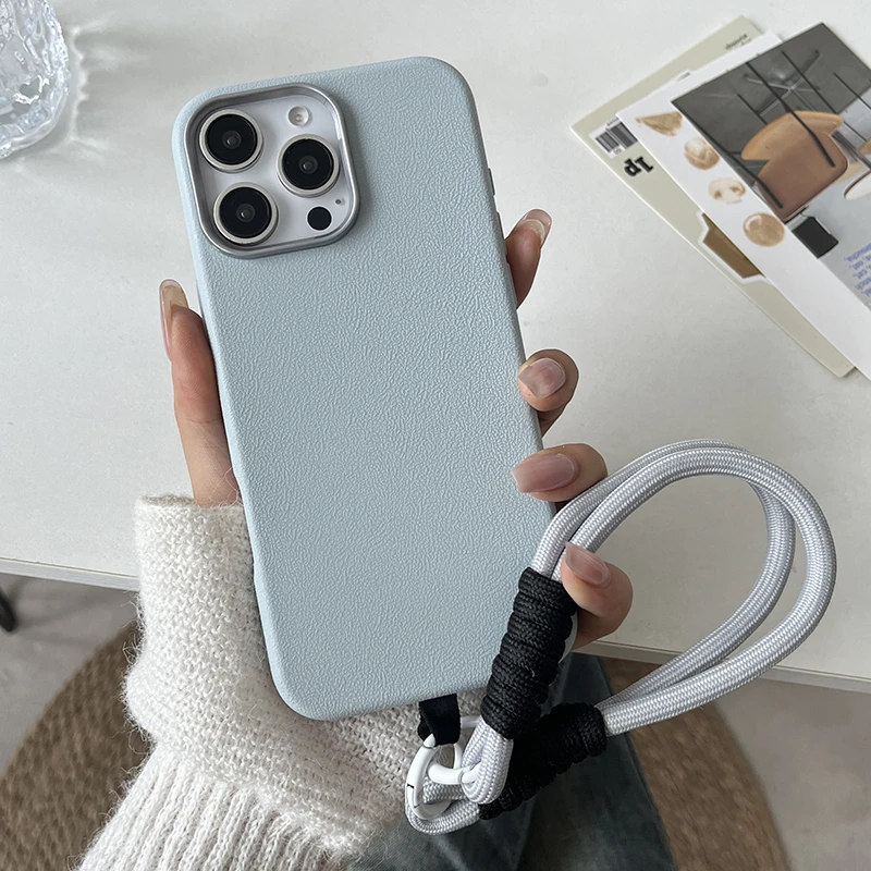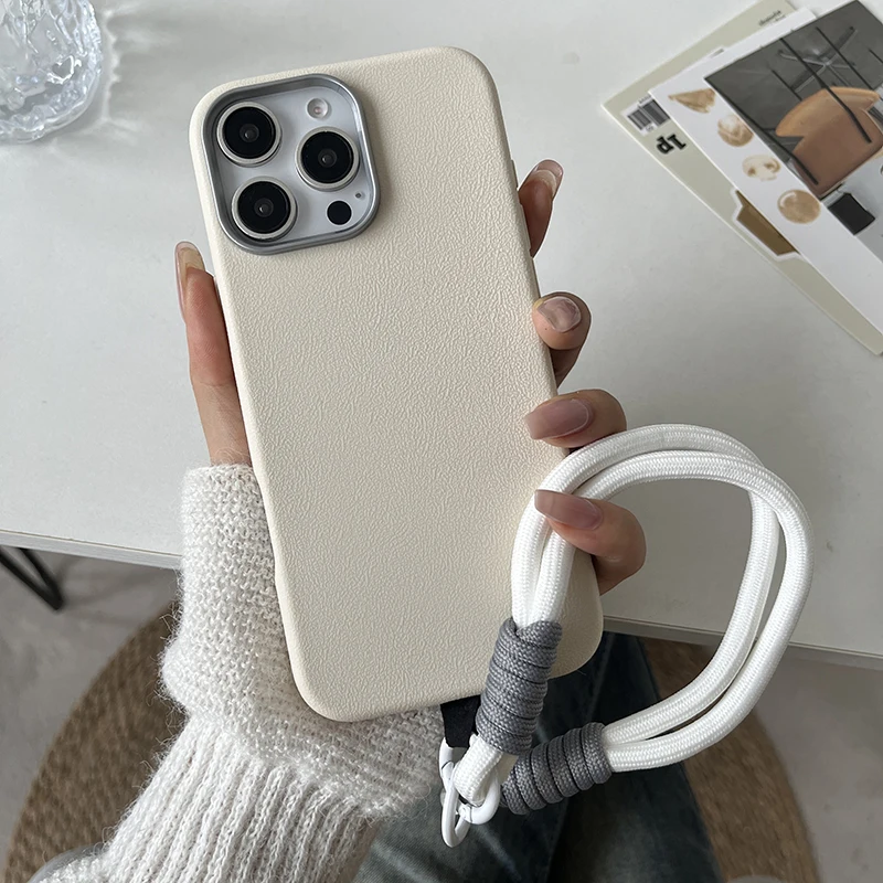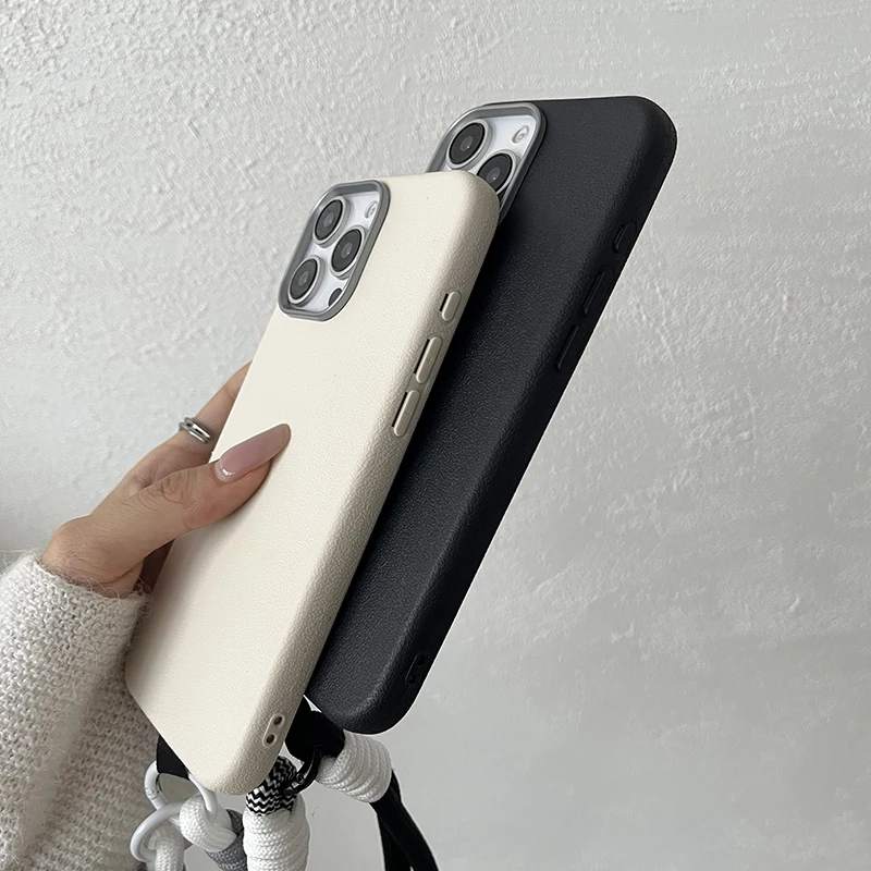 Luxury Matte Leather Lanyard Rope Phone Case For iPhone 16 15 14 Plus 13 12 11 Pro Max X XS Max XR 7 8 SE2 Lens Protection Cover