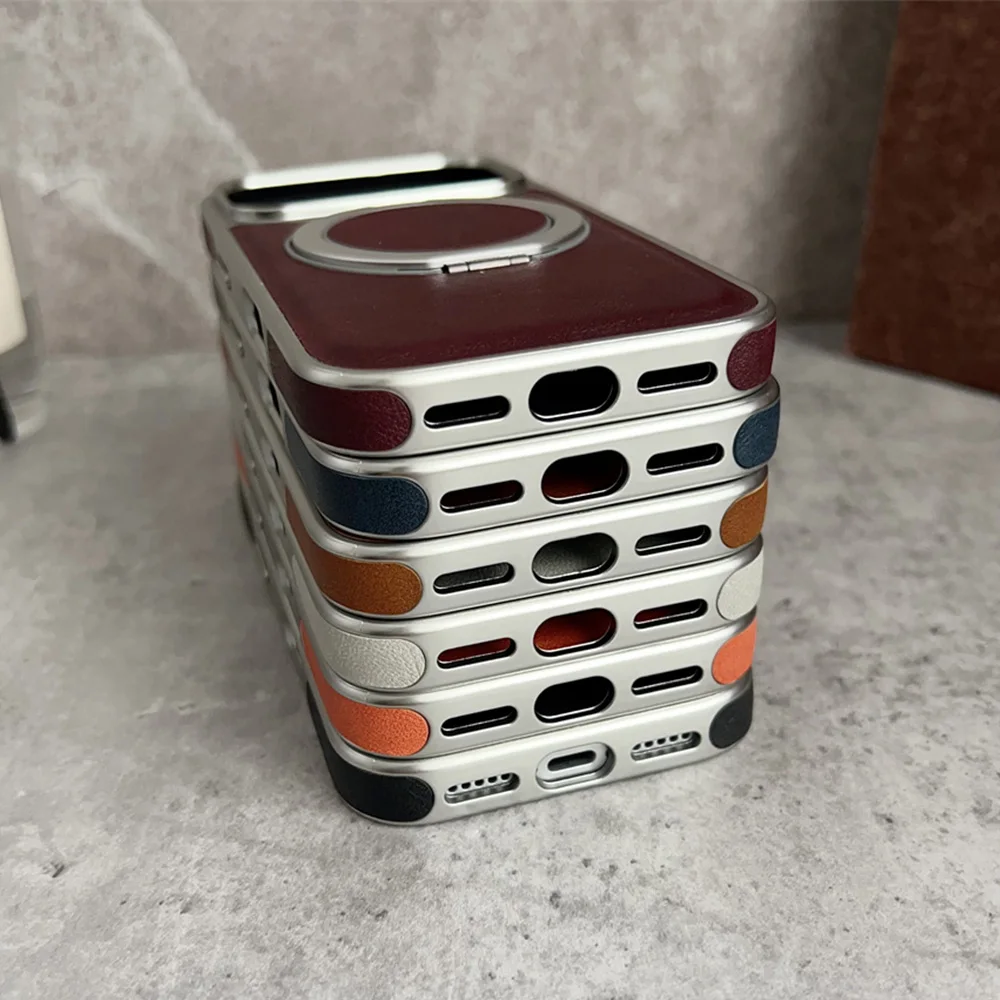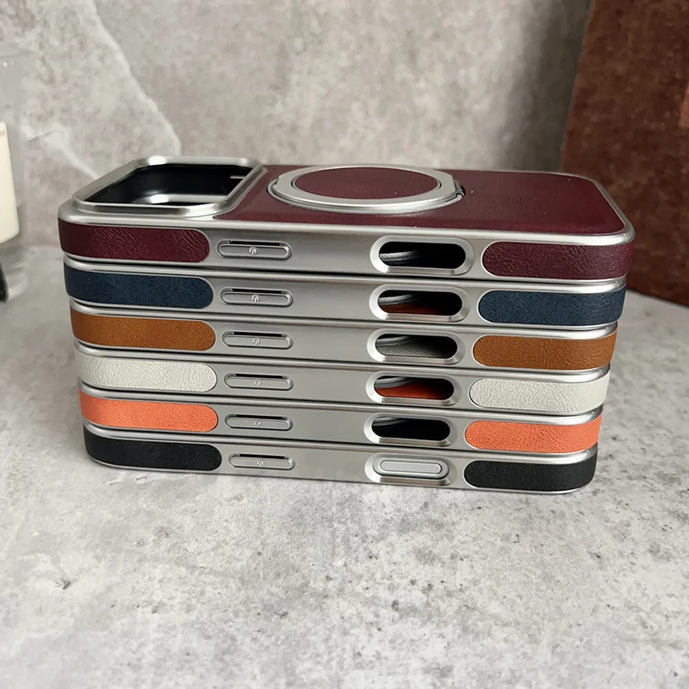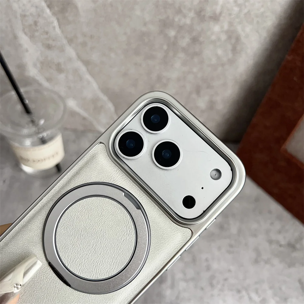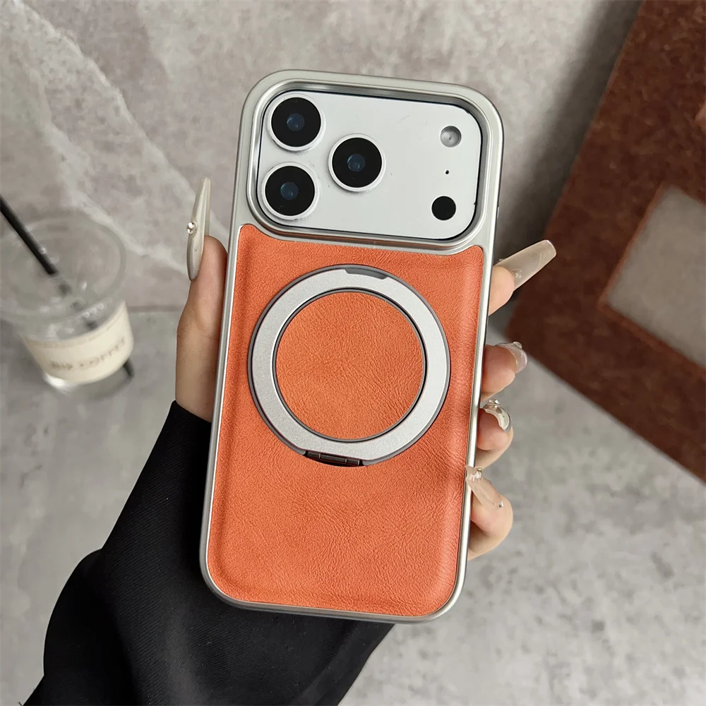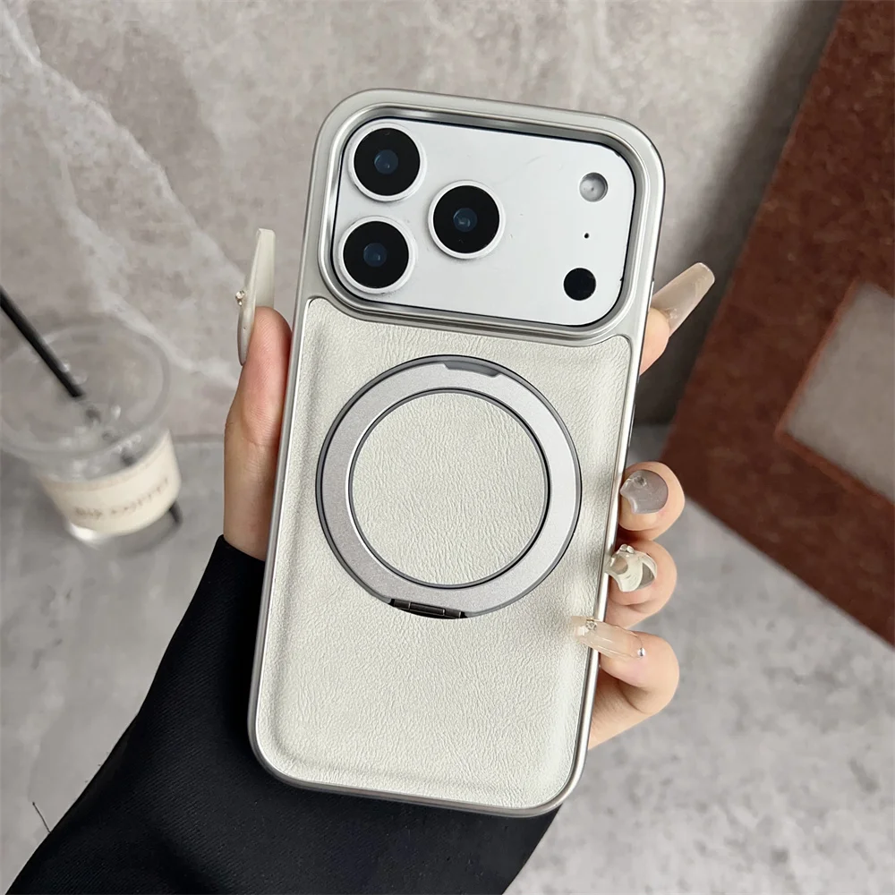 Funda de teléfono de cuero con soporte magnético con anillo magnético giratorio para iPhone 17 16 15 14 13 Pro Max Plus, funda protectora híbrida chapada en aire