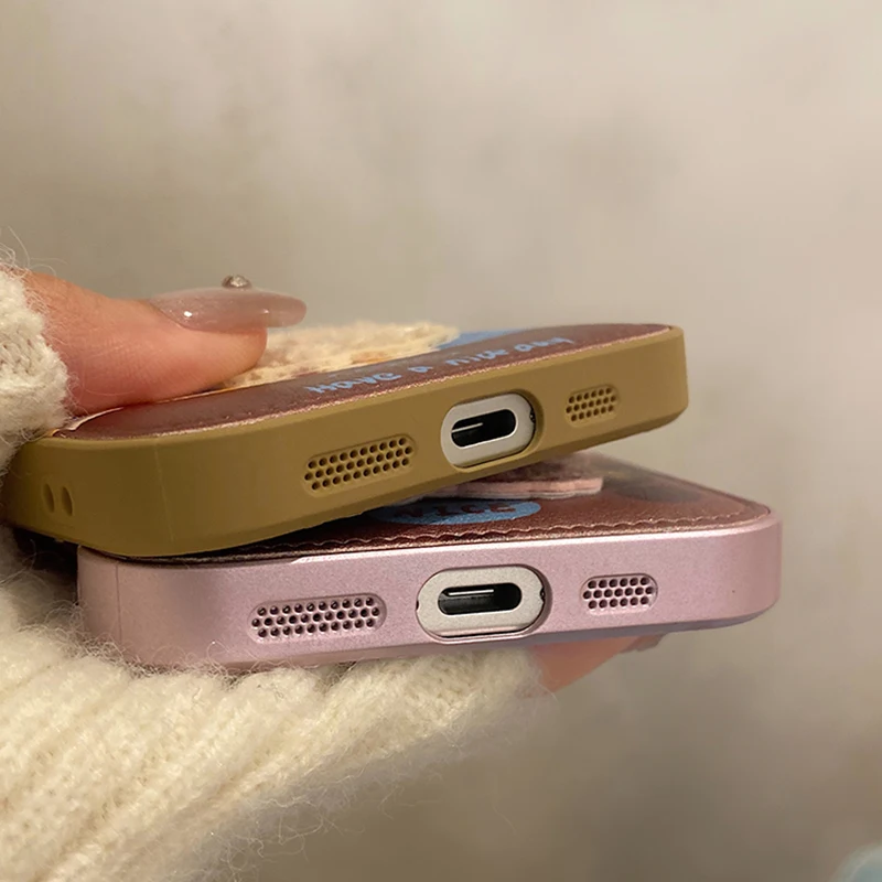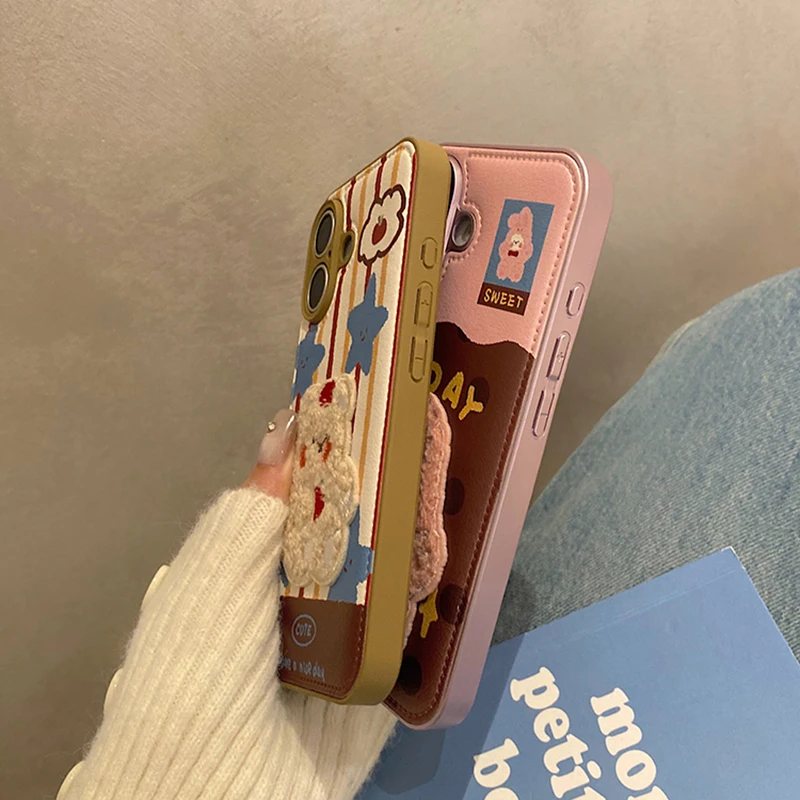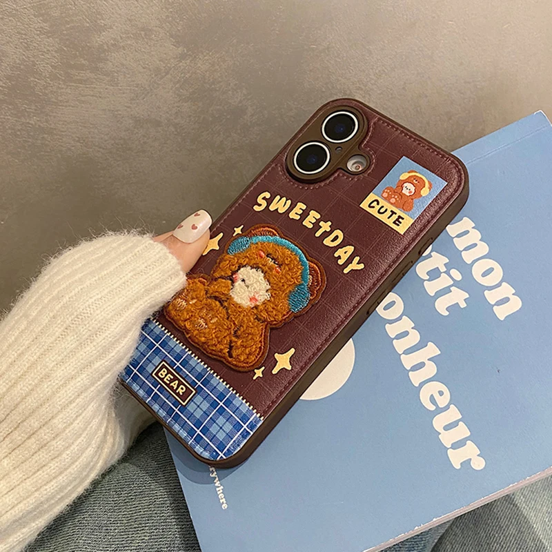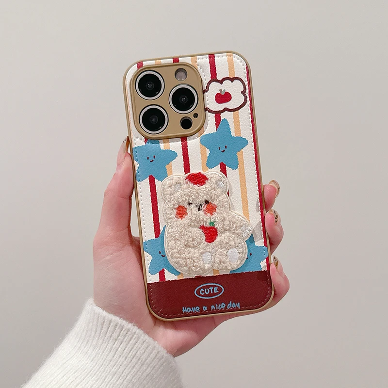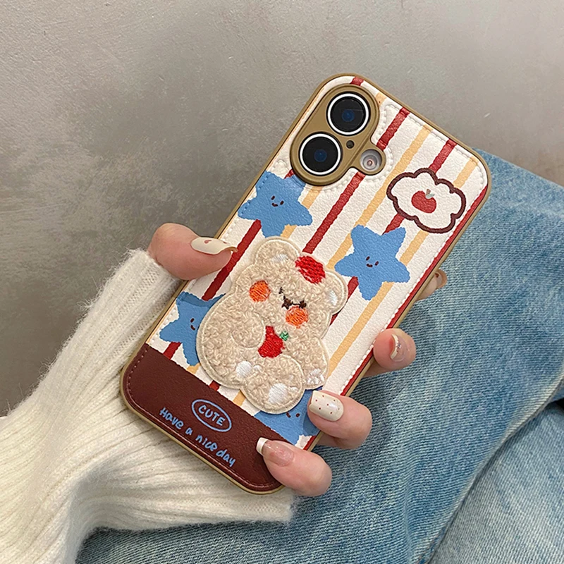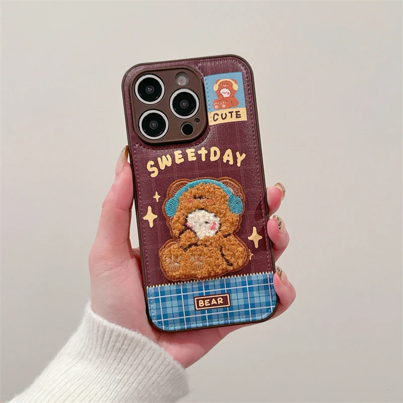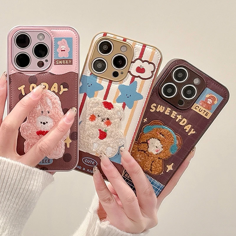 Cute 3D Plush Embroidered Rabbit Bear Phone Case For iPhone 11 12 13 14 15 16 Pro Max Leather Litchi Texture Back Cover