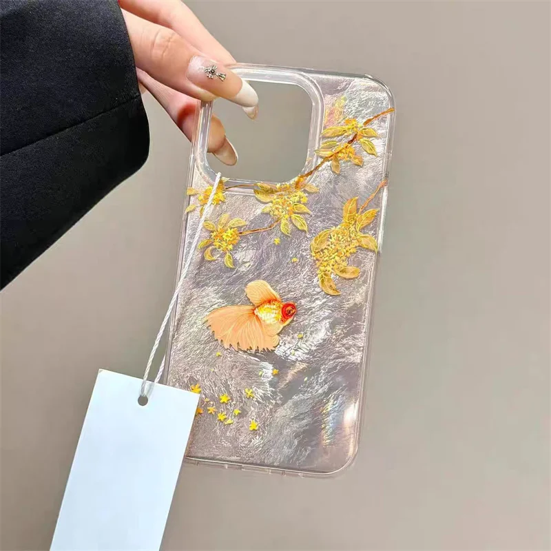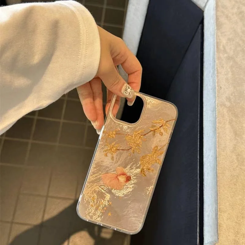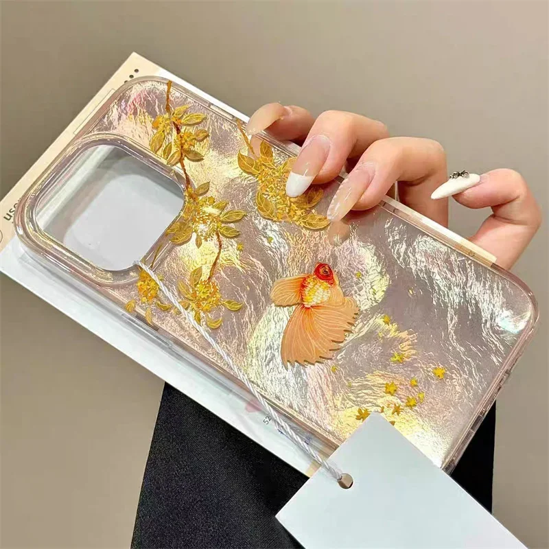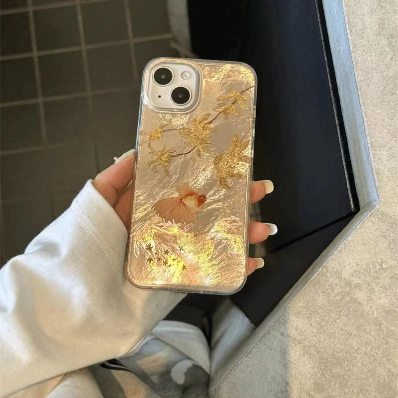 Funda dura para teléfono Fallen Leaf Goldfish con textura de papel de aluminio para iPhone 16 Pro Max 15 14 13 12 11 XS XR X 7 8 16 Plus, funda a prueba de golpes