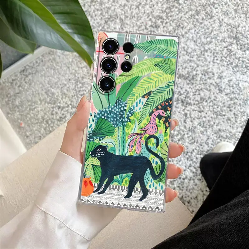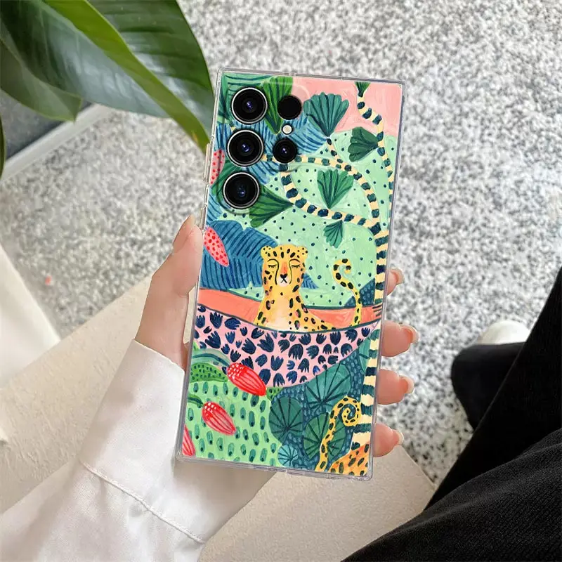 Funda de teléfono con diseño de selva Tropical Leopard Sloth Rainforest Cat para Samsung S24 S23 Ultra S22 S20 Plus S21 FE Fundas transparentes Funda Galaxy S24Ultra S235G Fundas