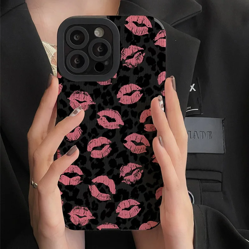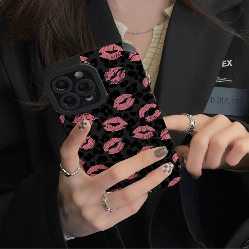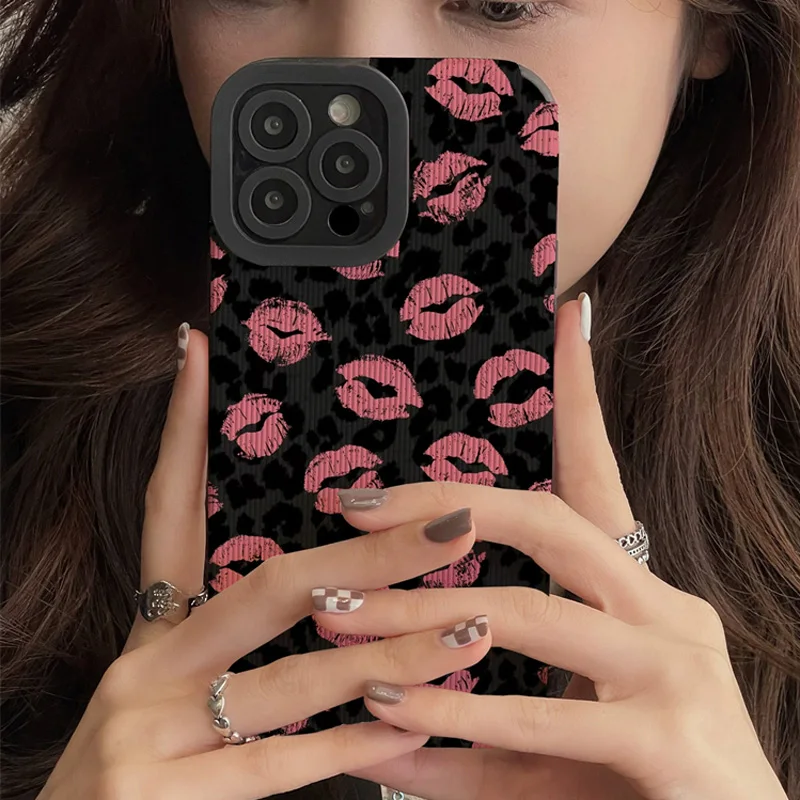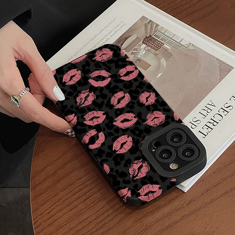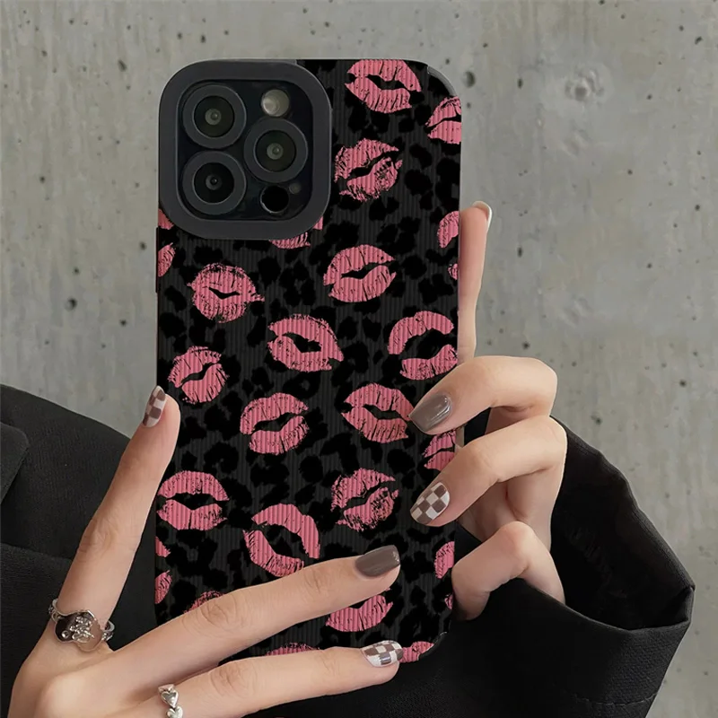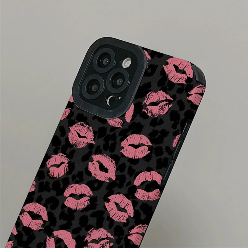 Comprar Funda de teléfono con estampado de leopardo y beso de labios rosas, carcasa de silicona suave para iPhone 14, 13, 12, 11 Pro Max, 7, 8 Plus, X, XS, XR, SE