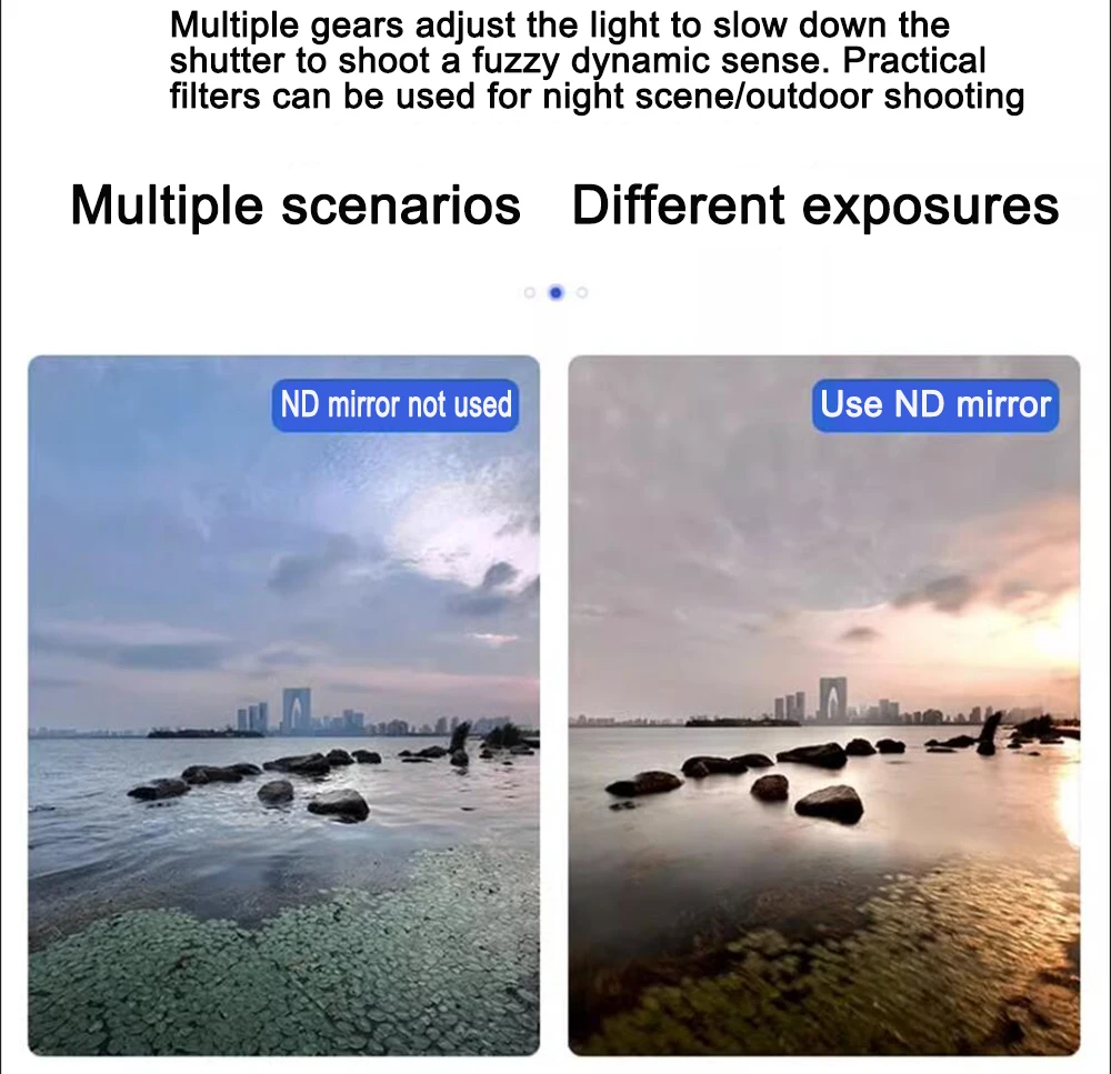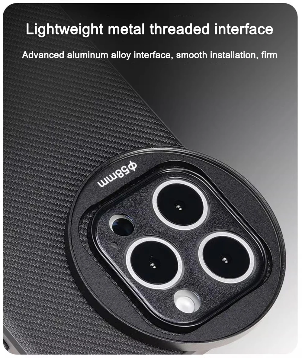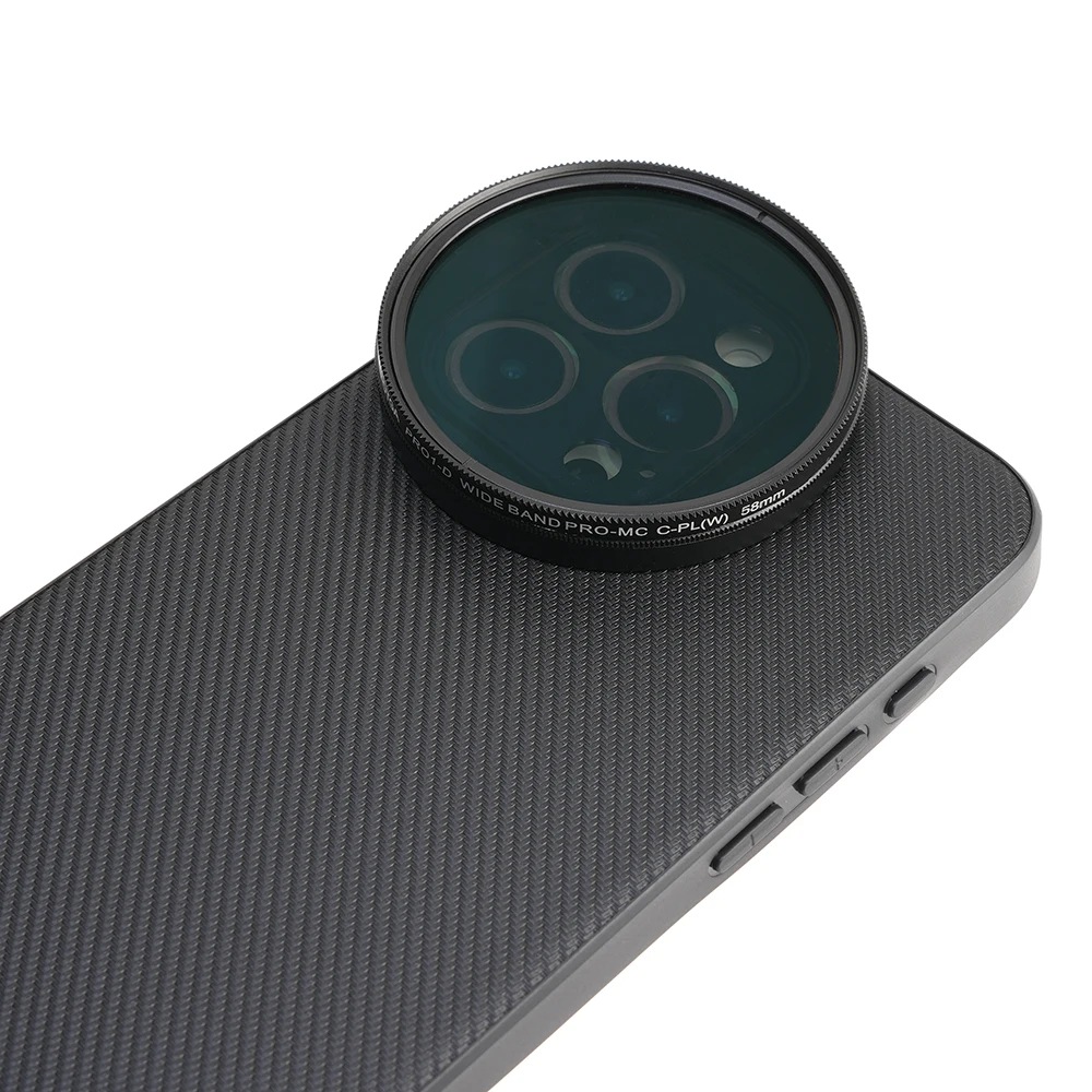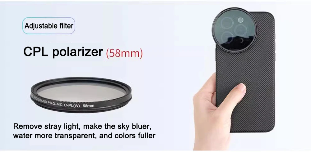Adaptador de filtro de liberación rápida de 58 mm: coloque el adaptador de filtro de 58 mm en la carcasa del teléfono y monte cualquier filtro de 58 mm, incluidos ND, CPL, difusión negra, contaminación ligera 8on y filtros de color degradados, para disparos artísticos, cinematográficos y expresivos.El adaptador de filtro de liberación rápida se puede conectar y quitar en un segundo.