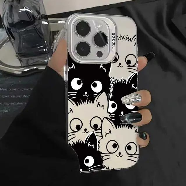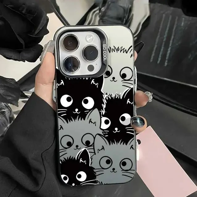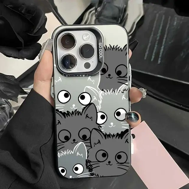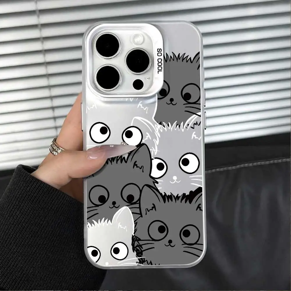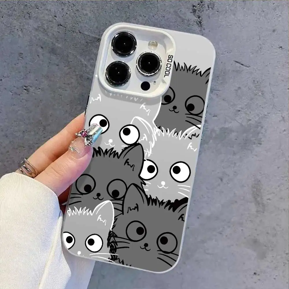 Funda de teléfono de gato de dibujos animados para iPhone 16 15 14 13 12 11 Pro Max Plus 15 16E X XS Max XR 7 8 Plus SE 2020 2022 funda de teléfono IMD plateada