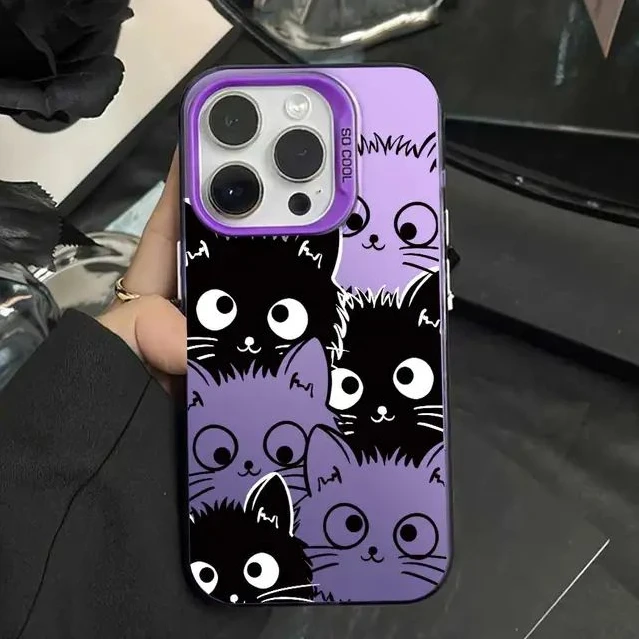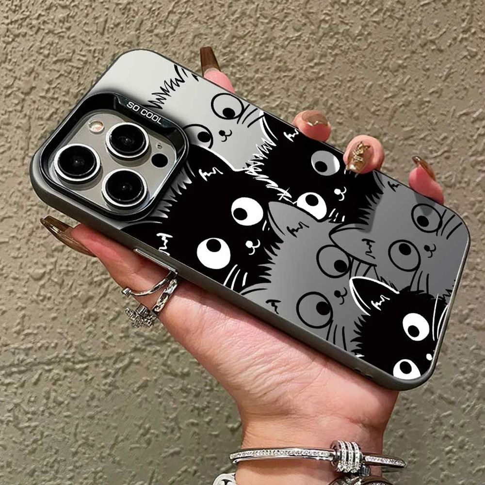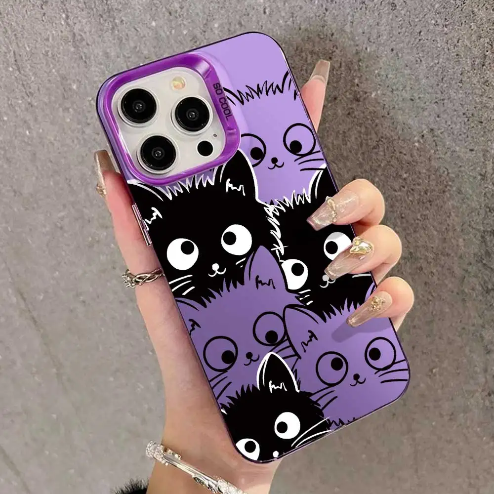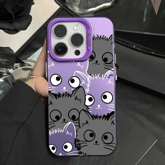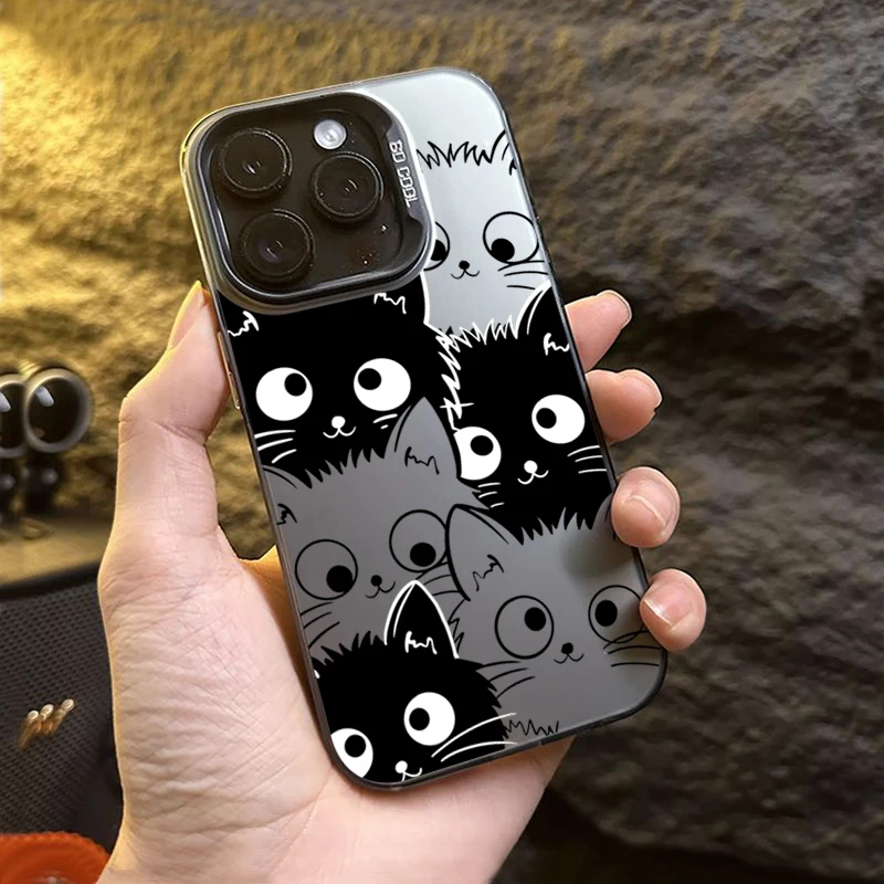 Funda de teléfono de gato de dibujos animados para iPhone 16 15 14 13 12 11 Pro Max Plus 15 16E X XS Max XR 7 8 Plus SE 2020 2022 funda de teléfono IMD plateada
