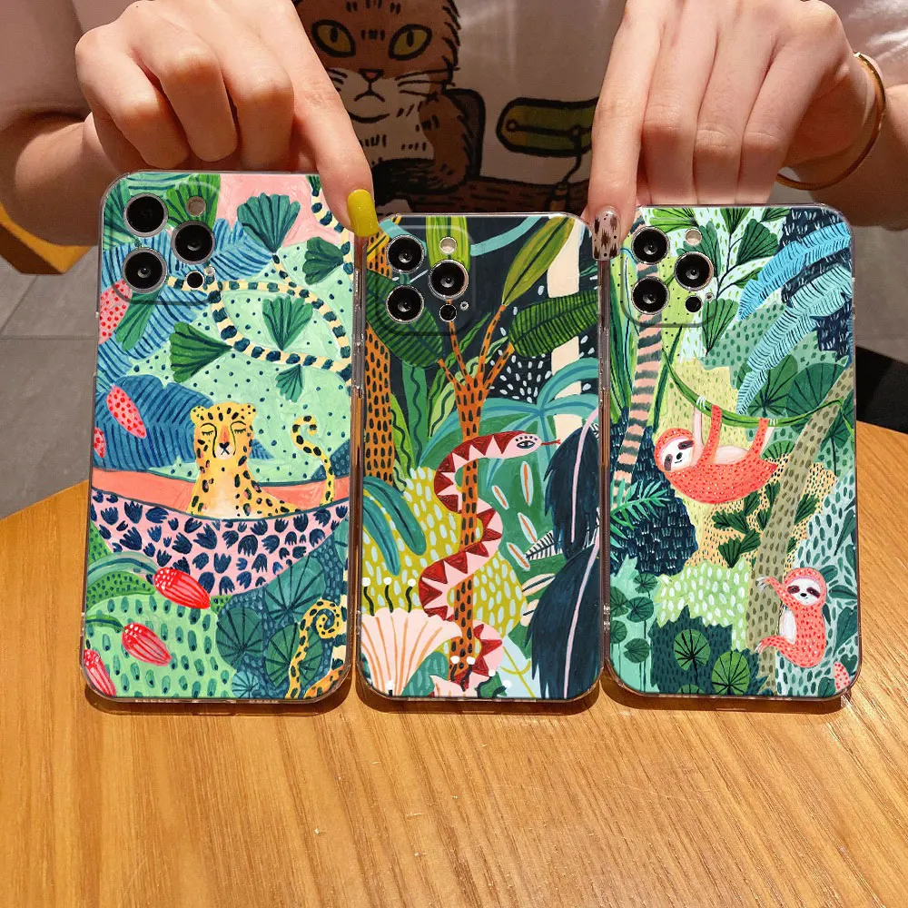 Ilustración de arte de la jungla Serpiente Gatos PerezososFunda de teléfono transparente para iPhone 11 15 14 Pro Max 12 13 Mini 16 Pro X XS XR 8 7 Plus funda transparente suave
